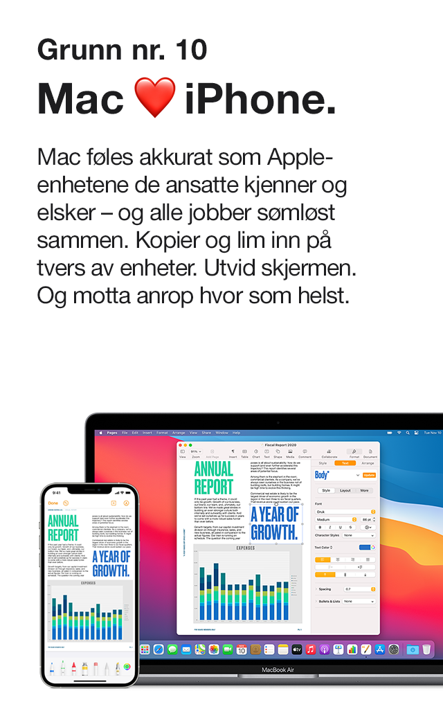 Mac føles akkurat som de mobile Apple-enhetene medarbeiderne kjenner og liker, og alle fungerer sømløst sammen. Kopier og lim inn på tvers av enheter. Begynn å skrive en e-post på én enhet og gjør den ferdig på en annen ved hjelp av Handoff. Og motta anrop hvor som helst.