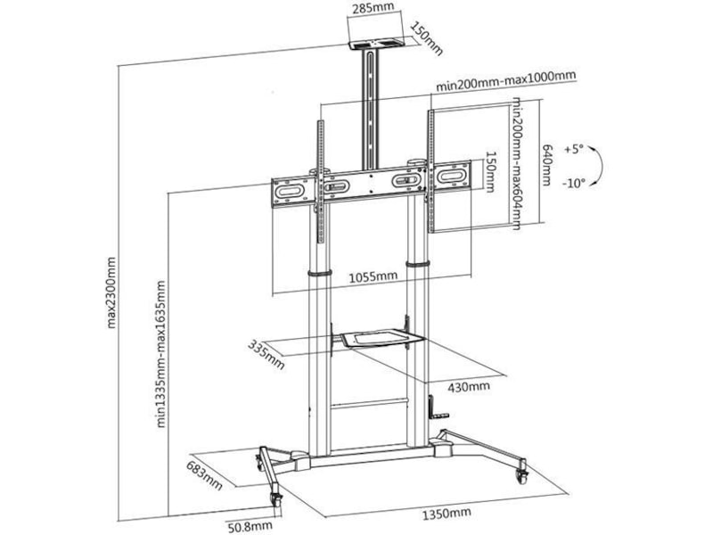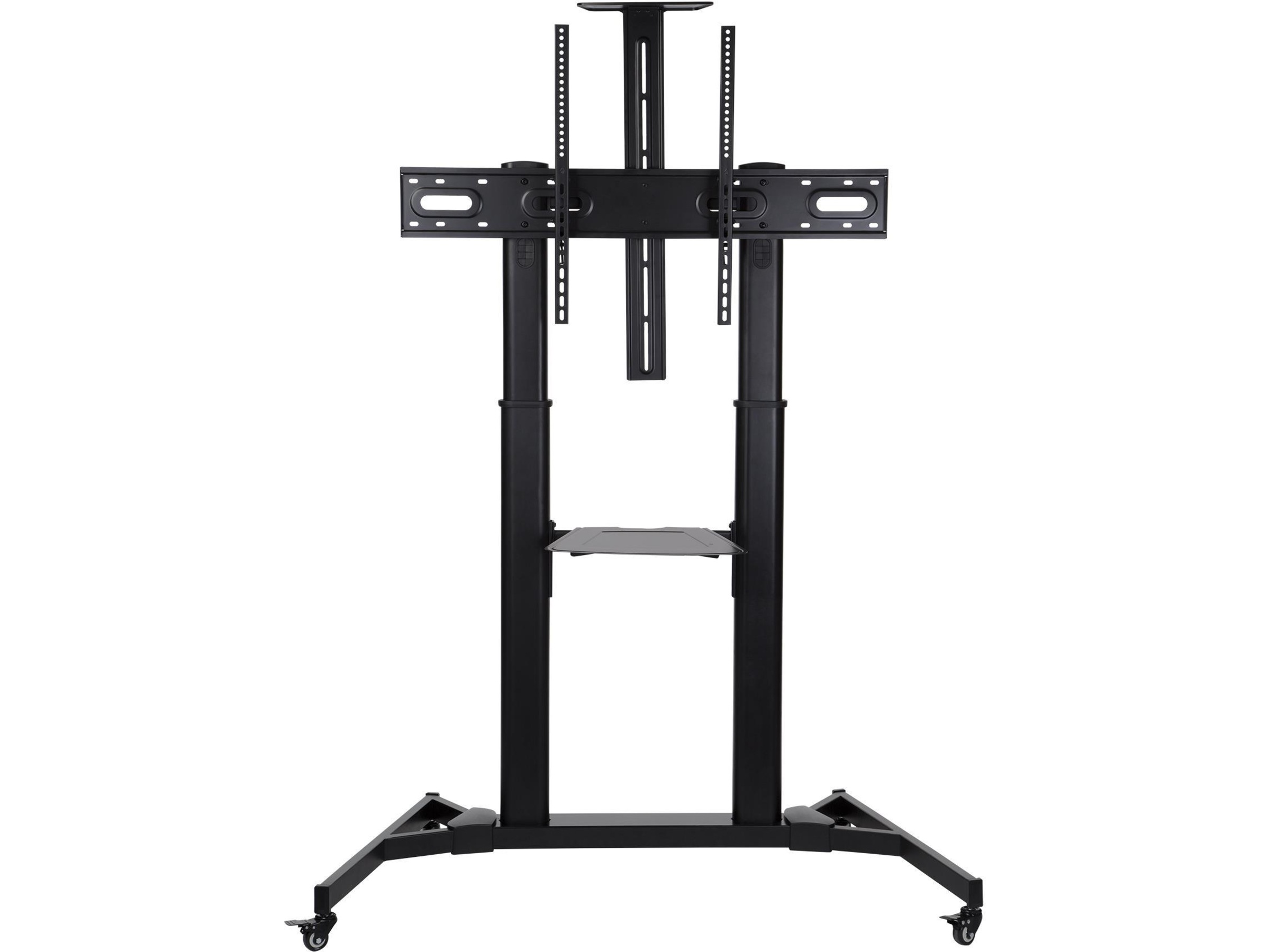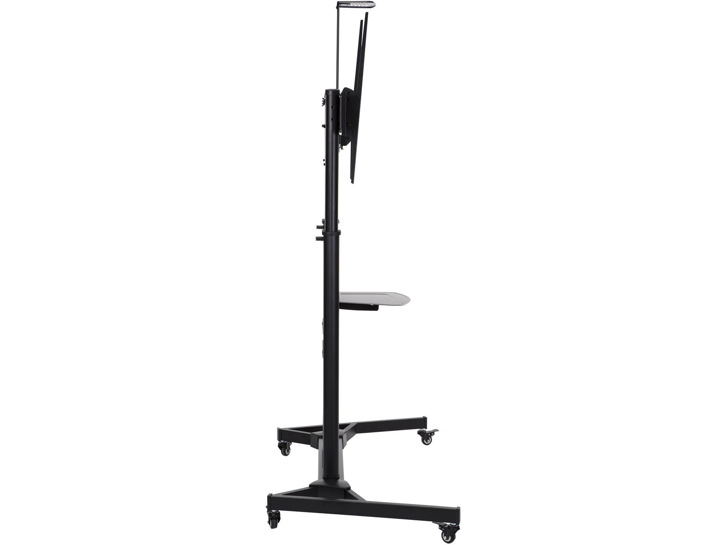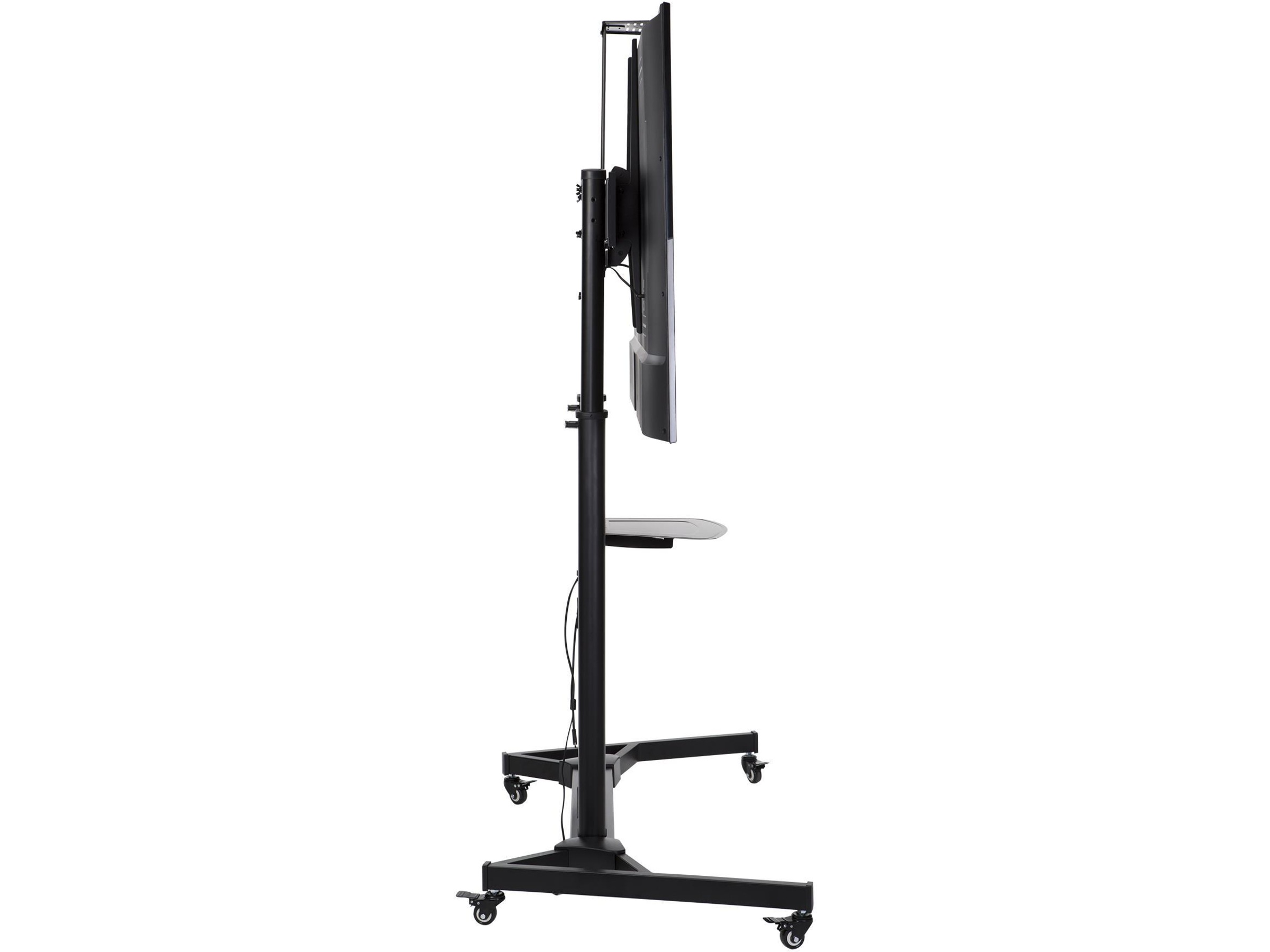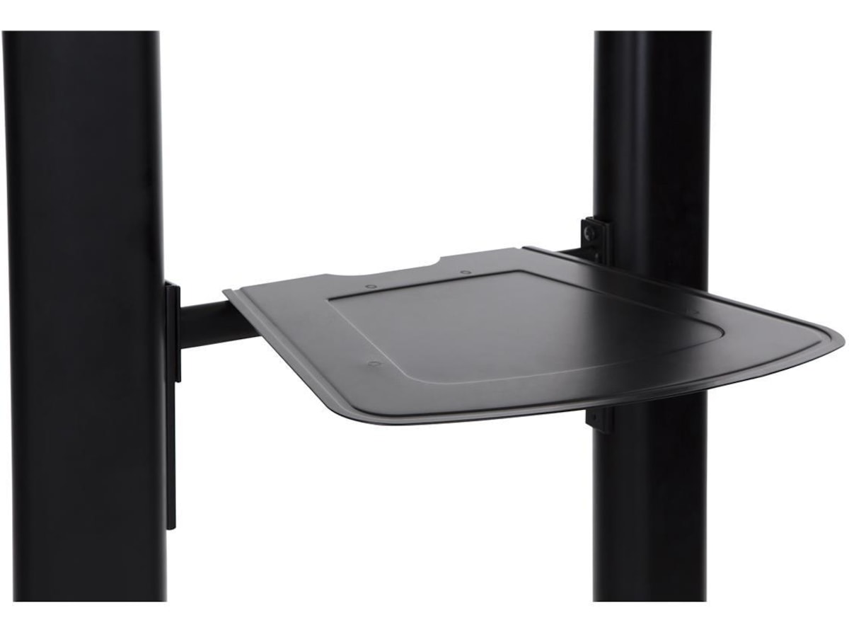 TV-trallen kommer med to praktiske hyller. Den ene er passe for en laptop. Den andre er plassert over flatskjermen for muligheter for webkamera. Du kan velge om du vil montere på disse hyllene. Skjermen du monterer kan også tiltes for optimal visningsvinkel. Den lar deg også montere public display i portrett visning og flate og kurvede skjermer. Med mange monteringsmuligheter, høyde, hjulsett, gir denne trallen deg mye fleksibilitet og mobilitet.