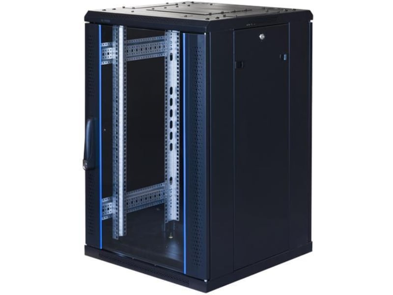 Det 19" gulvkabinettet har en front med glassdør med lufteåpninger på hver side av glasset, perforerte bakdører og avtagbare sidepaneler. Det har plass til kabelinnføring på bunnen og i taket. Taket har også plass til å installere viftepakken. Du kan ha kabinettet stående på hjul eller uten. Front- og bakdørene kan henges på enten høyre eller venstre side.