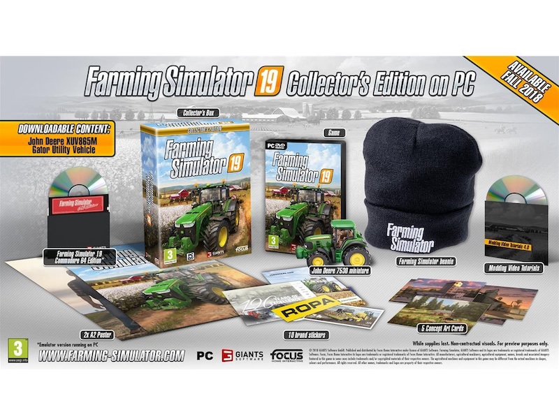| Ekstra artikler | Farming Simulator 19 Commodore 64 Edition, 2 Farming Simulator DIN A2 Poster, Farming Simulator Cap, John Deere 7530-modell, 10 merkeklebeetiketter, DVD with "Modding Video Tutorials 4.0", 5 begrepsgrafikkort, Collector's Box |