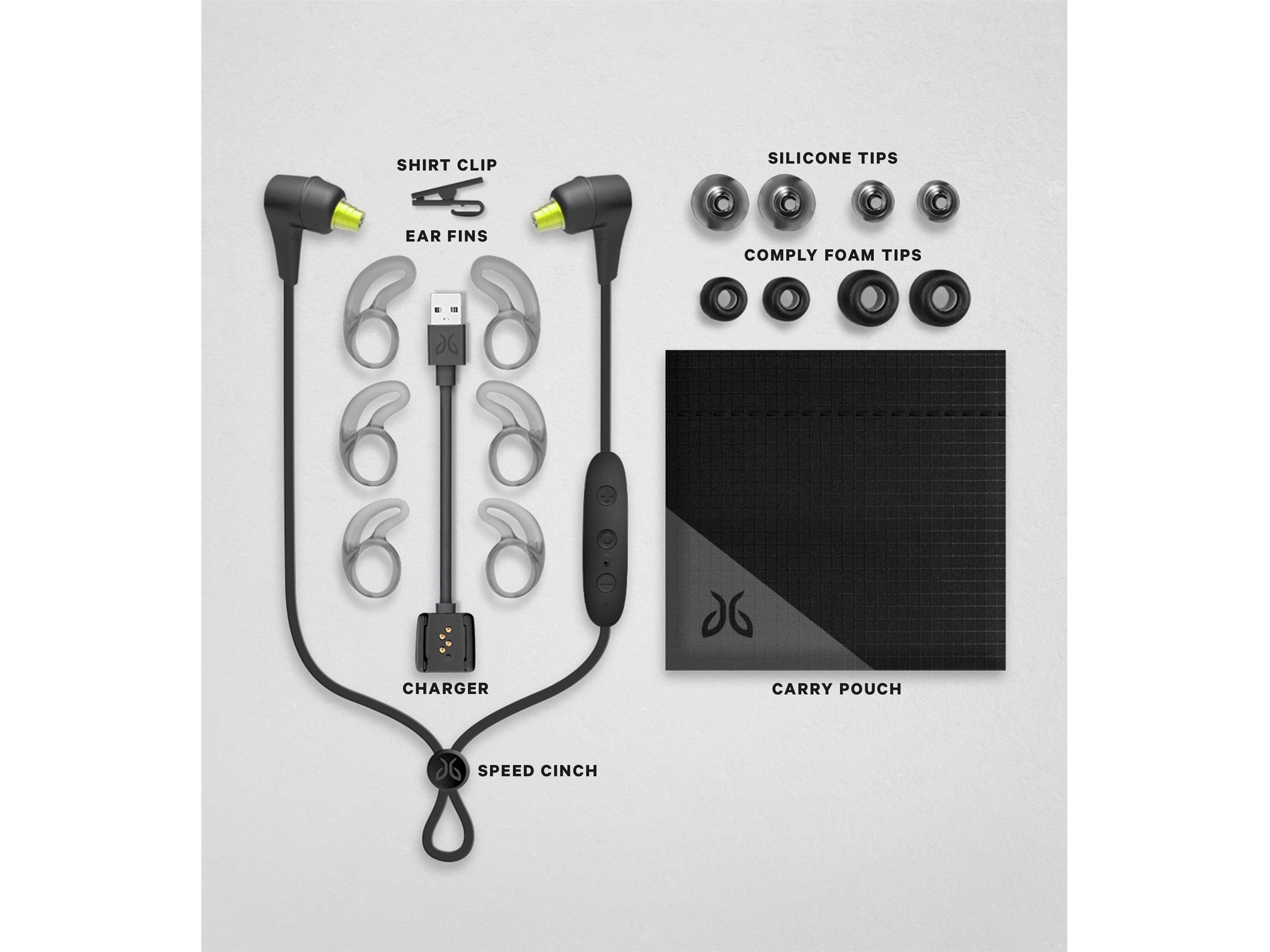 | Medfølgende tilbehør | Oval silikonøretupper (S/L), Rasksnøre, 3 størrelser av ørefinner med godt feste, Bærepose, Klesklype, Comply ultraøretupper (M/L), Ladeholder |