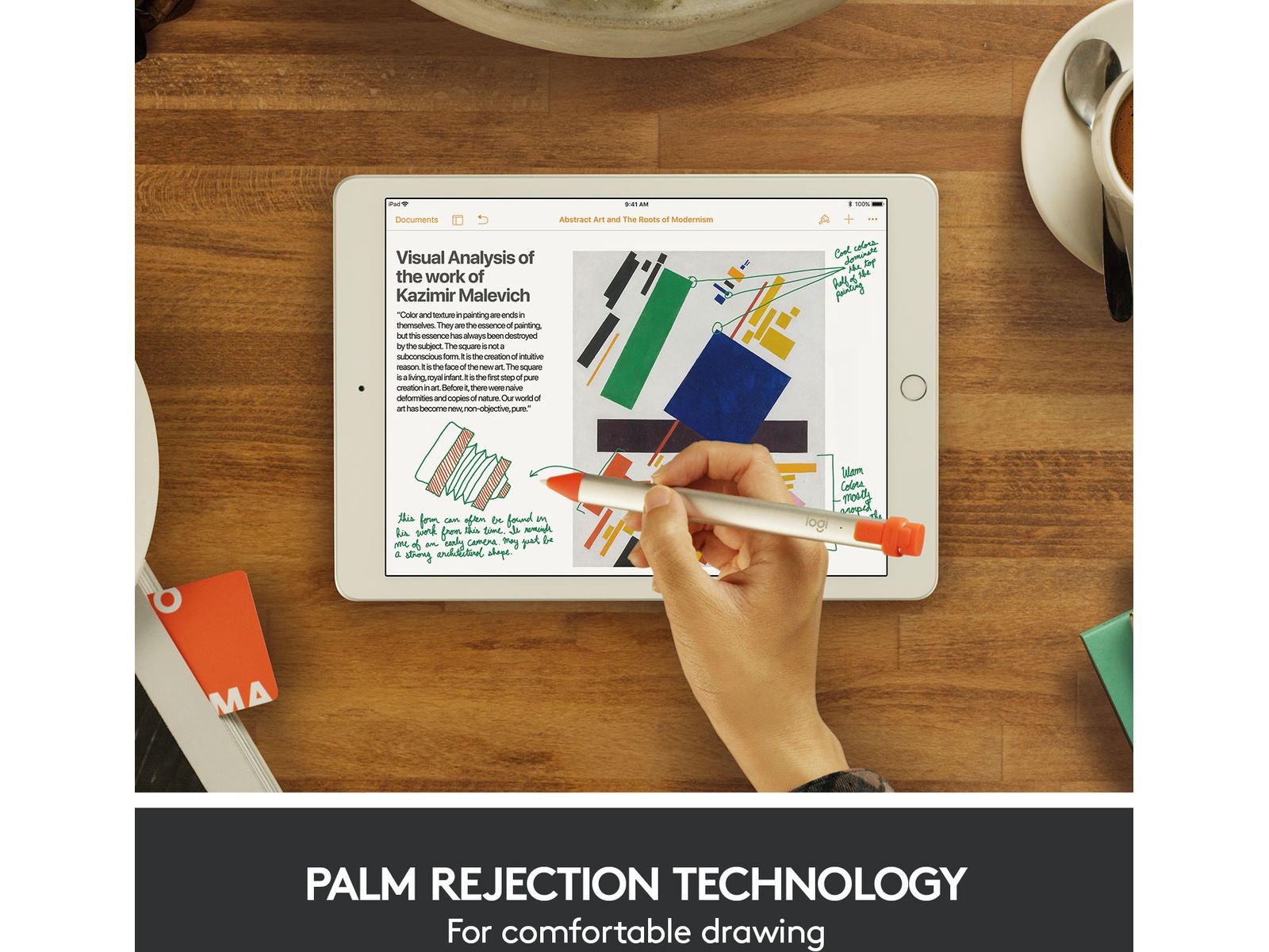 Bare hvil håndleddet på skjermen mens du skriver. iPad støtter håndleddsavvisningsteknologi for å gi hånden din en naturlig posisjon mens du bruker Logitech Crayon. Nå kan du slutte å bekymre deg om hendene og fokusere på oppgaven din i stedet.