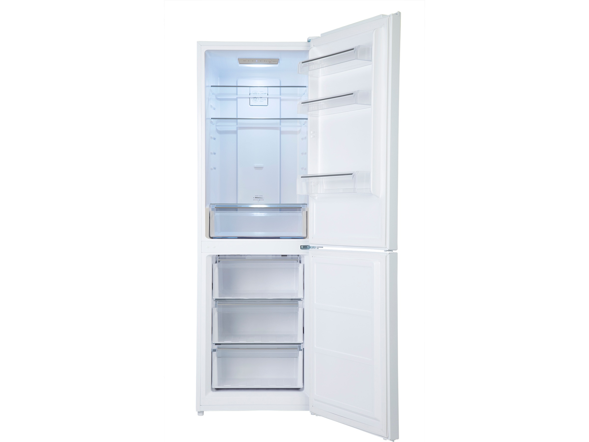 iiglo kombiskap med kjøler og fryser, er alt du trenger for å oppbevare dine matvarer til rett temperatur. Kombiskapet har et kontrollpanel øverst på innsiden av skapet. Dette panelet kommer med LED-display og berøringsknapper, som lar deg se og styre temperaturen på kjøler og fryser. I tillegg kan du velge mellom ulike innstillinger som ECO-mode, ferie-mode og super-mode. Kombiskapet har en tastelås som du kan skru av ved å holde «MODE»-knappen inne i 3 sekunder, denne tastelåsen vil skru seg på igjen etter 25 sekunder. Hvis døren ikke blir lukket, vil du høre en alarm som slutter å pipe i det du lukker igjen døren. Dørene kan monteres på begge sider for høyre/venstre åpning, og passer derfor inn i de fleste kjøkken.