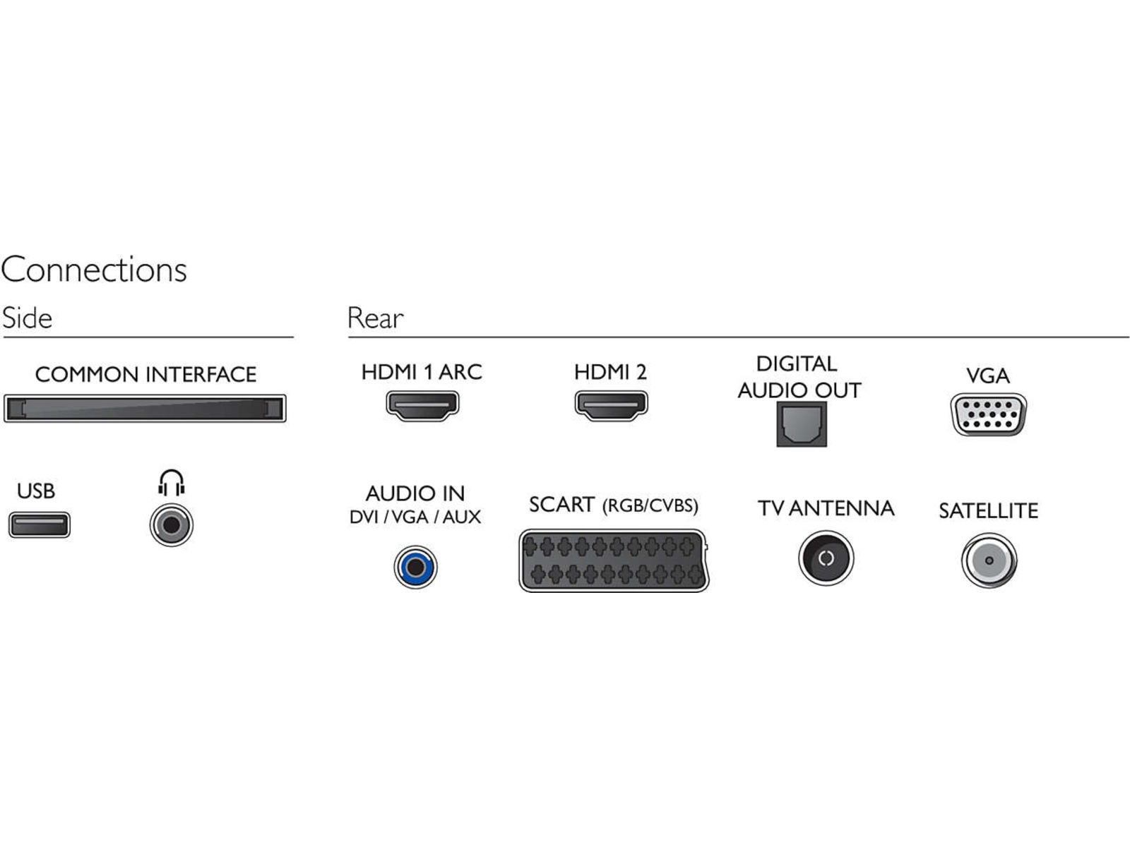 | Kontakttype | SCART (RGB / kombinasjon) - bak, VGA-inndata - bak, Digital lydutgang (optisk) - bak, Lydinngang - bak, Hodetelefoner - side, 2 x HDMI - bak, USB - side |