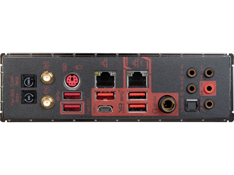 | Grensesnitt | 1 x lydinnlinje - minijakk, 1 x USB-C Gen2, 1 x lydutlinje/hodetelefon - stereo-jack 6,3 mm, 1 x TOSLINK, 1 x LAN (2.5Gigabit Ethernet), 1 x LAN (Gigabit Ethernet), 3 x USB 3.2 Gen 2, 1 x lydutlinje (bakre) - minijakk, 2 x USB 3.2 Gen 1, 1 x lydutlinje - minijakk, 1 x mikrofon - minijakk, 1 x PS/2-tastatur / -mus, 1 x lydutlinje (senter/subbasshøyttaler) - minijakk |
