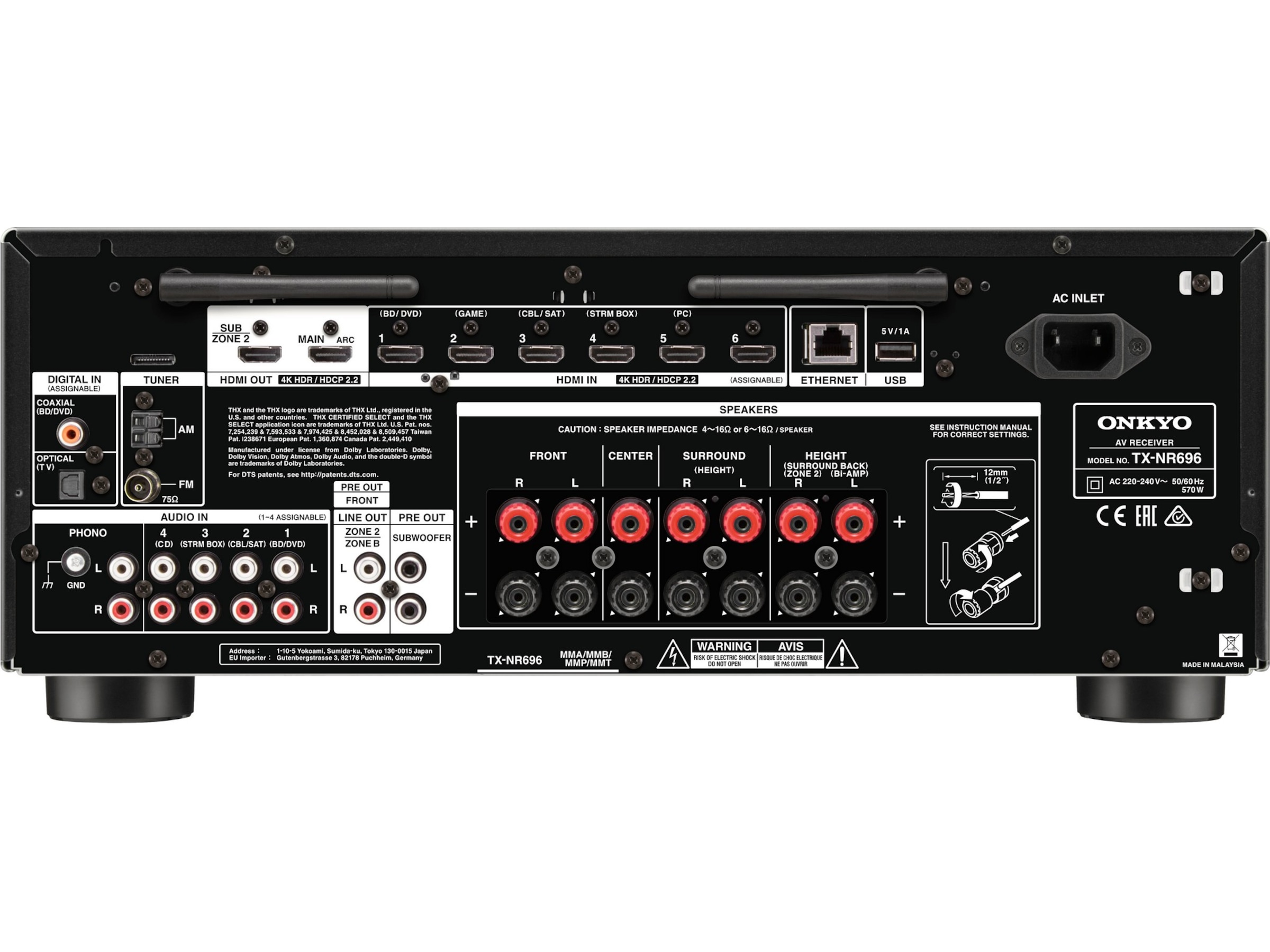 | Andre egenskaper | Mørk farge, BT.2020 Support, Fjernkontrollert smartphone, MM-patroner støttet, Lydreturkanal (ARC), x.v.Color, Komprimert musikkforsterker, Dobbeltsonemulighet, AccuReflex-teknologi, Vector Linear Shaping Circuitry (VLSC), Pure Direct-modus, AccuEQ kalibrering av romakustikk, Innebygd Chromecast, THX Select-godkjent, FlareConnect-multiromlyd |