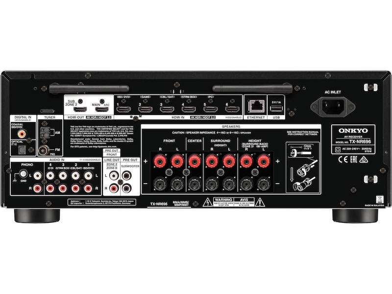 | Koblinger | 6 x HDMI-inngang (19-pin HDMI type A) - bak, SPDIF-inngang (RCA) - bak, 2 x basshøyttaler-utgang (RCA) - bak, USB (4 pin USB Type A) - bak, Lydinngang (minijack stereo 3,5 mm) - foran, Nettverk (RJ-45) - bak, SPDIF-inngang (TOSLINK) - bak, Hodetelefoner (6,3 mm-stereojakk) - foran, Fonoinngang (RCA phono x 2) - bak, HDMI-inngang (19-pin HDMI type A) - foran, Lydutgang (flere soner) (RCA phono x 2) - bak, 9 x utgang høyttalere (banan/spade x 2) - bak, 2 x HDMI-utgang (19-pin HDMI type A) - bak, 4 x lydinngang (RCA phono x 2) - bak |
