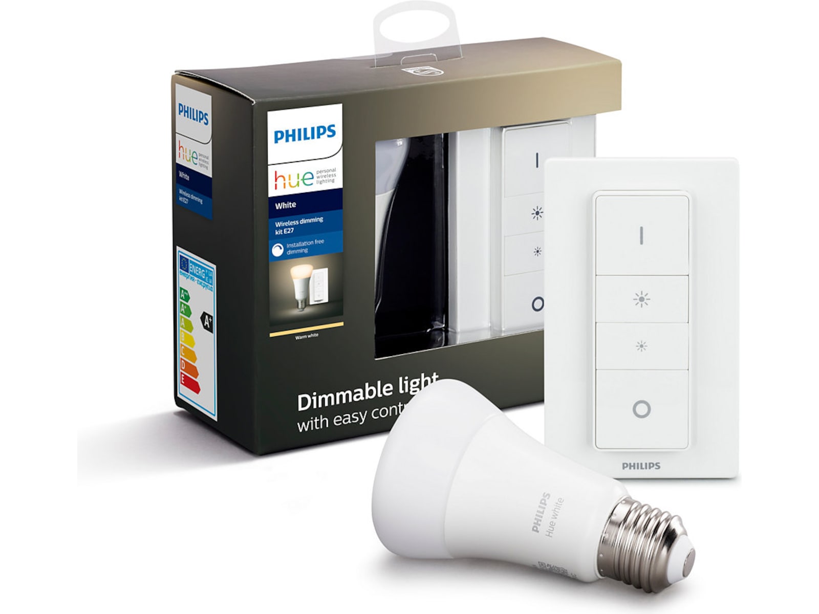 | Størrelses- og vektdetaljer | Dimmebryter - bredde: 35 mm x dybde: 11 mm x høyde: 92 mm x diameter: 61 mm - 37 g, Veggplate - bredde: 70 mm x dybde: 14 mm x høyde: 115 mm - 30 g, Lyspære høyde: 110 mm x diameter: 61 mm |
