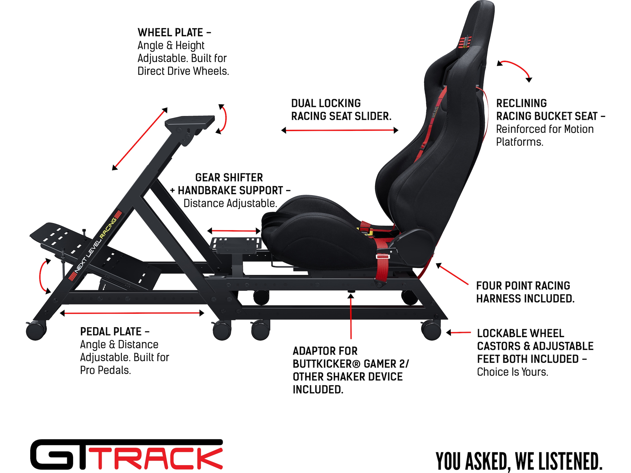 GTtrack har alle detaljene inkludert for seriøs som-racing slik som 4 punkts racerbelte, girspak og hånbrekkadapter, adapter for Buttkicker® Gamer 2, høydejusterbar gummibein for cockpiten og den nye Next Level Racing® låsbare svinghjul som lar deg bevege cockpiten rundt på enkelt vis og låse hjulene for seriøs racing.