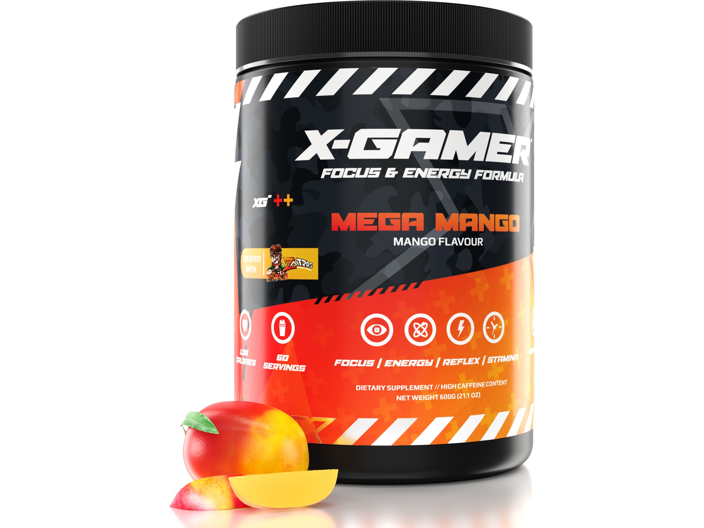 Kraft til å vinne med 600g fokus & energi protub med den deilige Mega Mangosmaken fra X-Gamer. Vår beste formel noensinne kombinert med fantastisk ny smak. En avansert, nyskapende og kraftig energigivende drink, utelukkende formulert for esports, semiprofesjonelle og entusiastiske spillere. X-Gamer er sukkerfri og inneholder også et 27 Multi-Vitamin Complex for å beskytte kroppen din og Nootropic Amino for å skjerpe sinnet. Inneholder bare 31 K-kalorier per 500 ml ferdig blandet.
