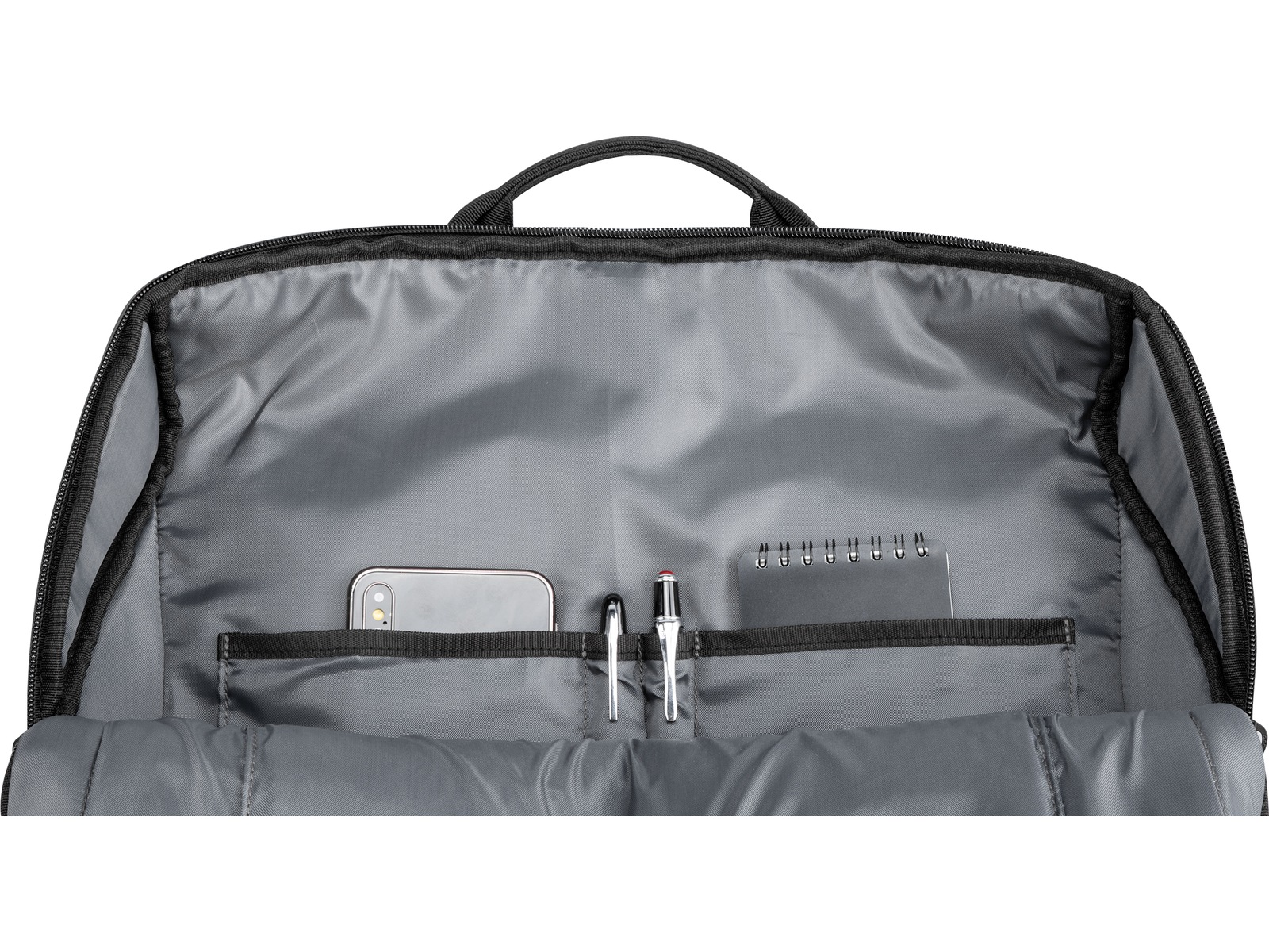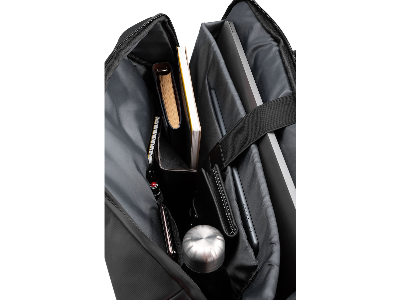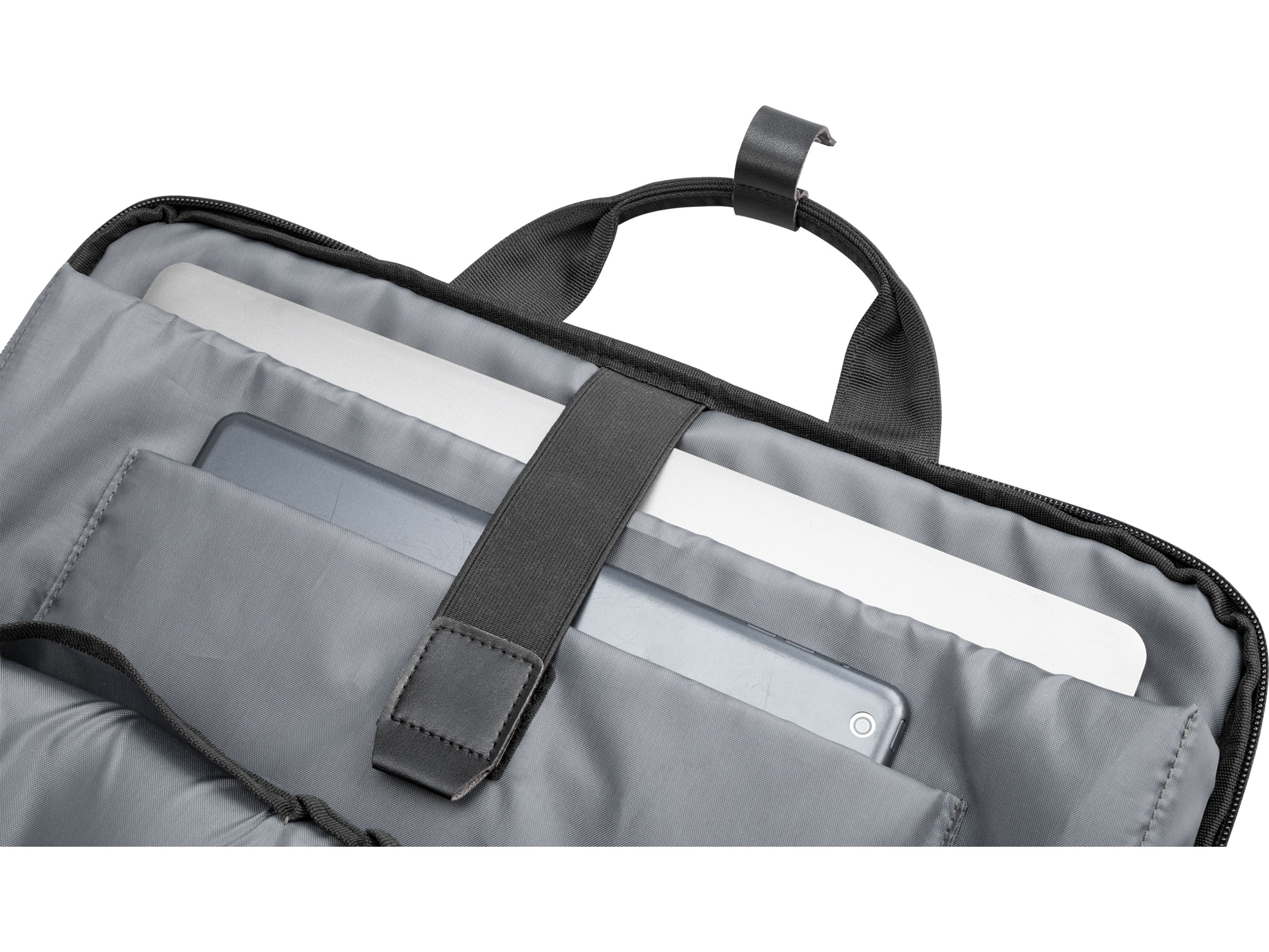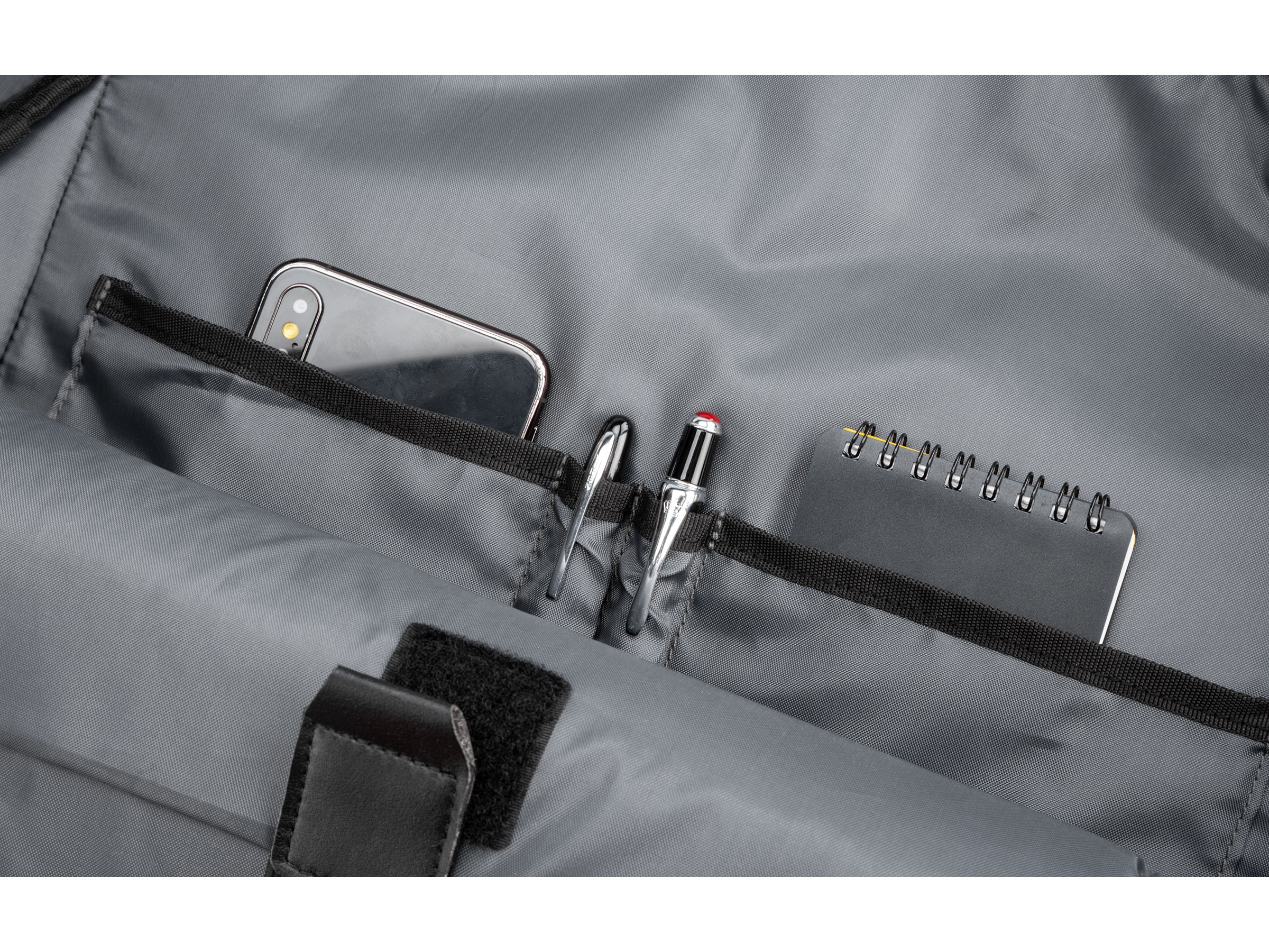 - Egen lomme for laptop opptil 15.6" og lomme for nettbrett opptil 11" gjør at du alltid vet hvor du har utstyret ditt når du trenger det, en praktisk strikk holder alt på plass. I tillegg er det to praktiske lommer til små ting og to rom for penner. På utsiden av vesken er det en stor lomme med glidelås.