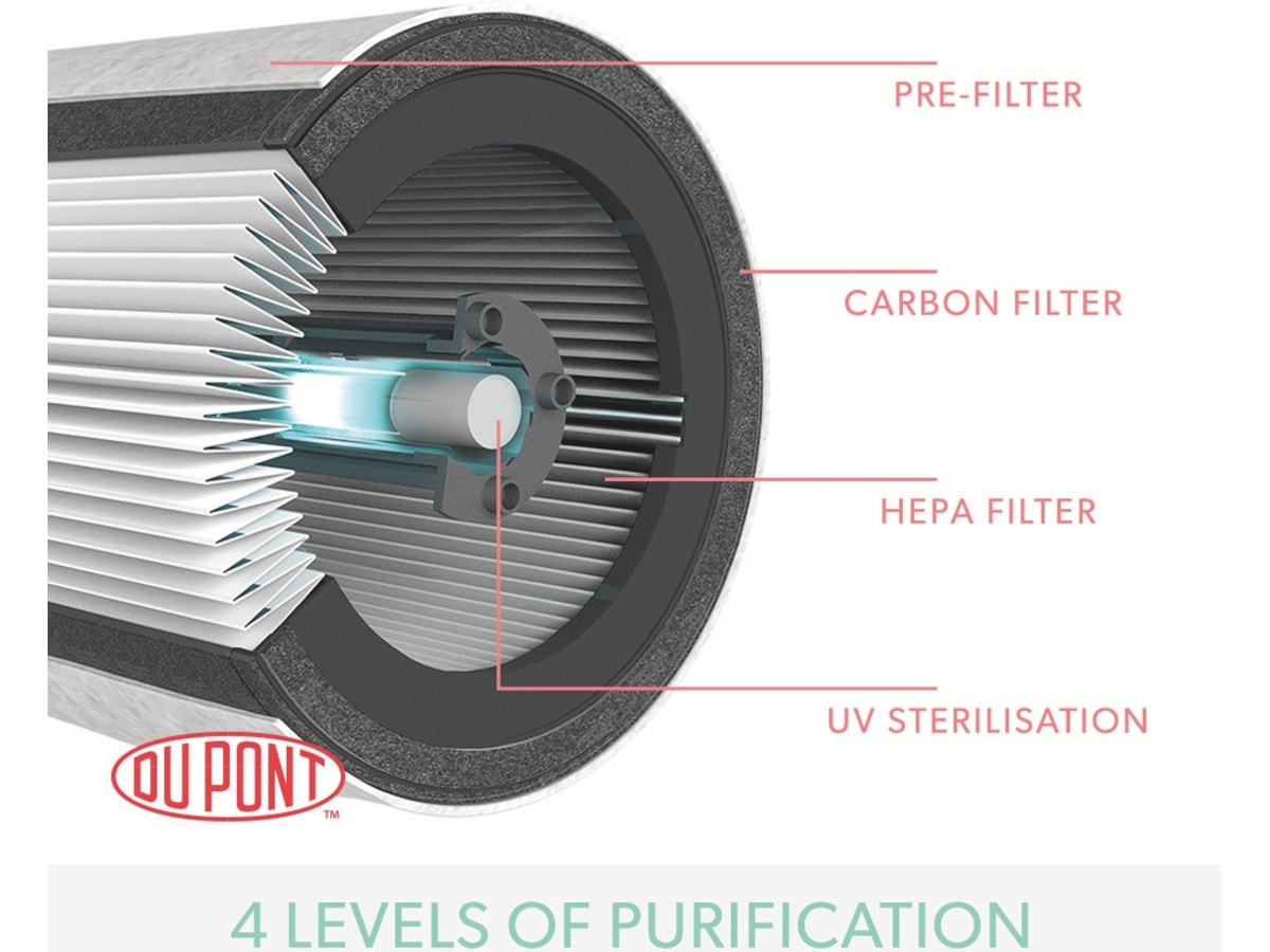 360 graders HEPA-filter fanger opp 99,97 partikler ned til 0,3 mikron og et kullfilter fjerner VOC-gasser/lukt fra alle retninger. UV-C lampen inni maskinen dreper virus og bakterier som kan bli fanget i filteret.