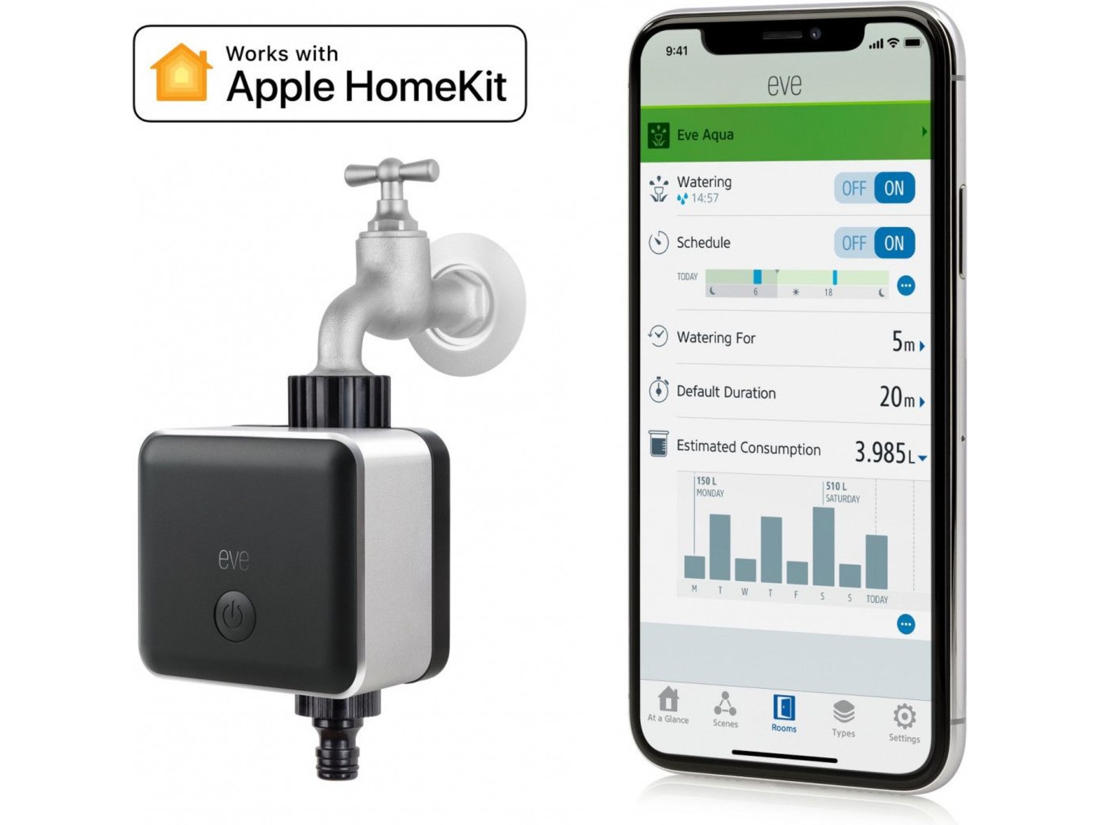 Skru på vannsprederen akkurat når du ønsker, automatisk. Eve Aqua forvandler vannkranen din til en smart vannkran, slik at du kan enkelt kan holde hagen din grønn og frodig. I den medfølgende appen så kan du følge med på vannforbruket ditt, og sette opp planlagte vanninger. Hvis den også kobles mot en hjemmeliggende iPad, Apple TV eller HomePod så kan du styre Eve Aqua når du ikke er hjemme.