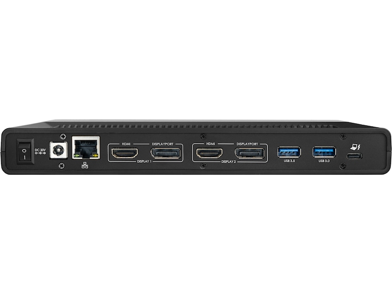 Dokkingstasjonen muliggjør en oppløsning på opptil 4K på 60 Hz for to skjermer via HDMI/HDMI-, DP/DP- eller HDMI/DP-utganger. I tillegg støtter den en oppløsning på 5K på 60 Hz for én enkelt skjerm via to DisplayPort-porter.