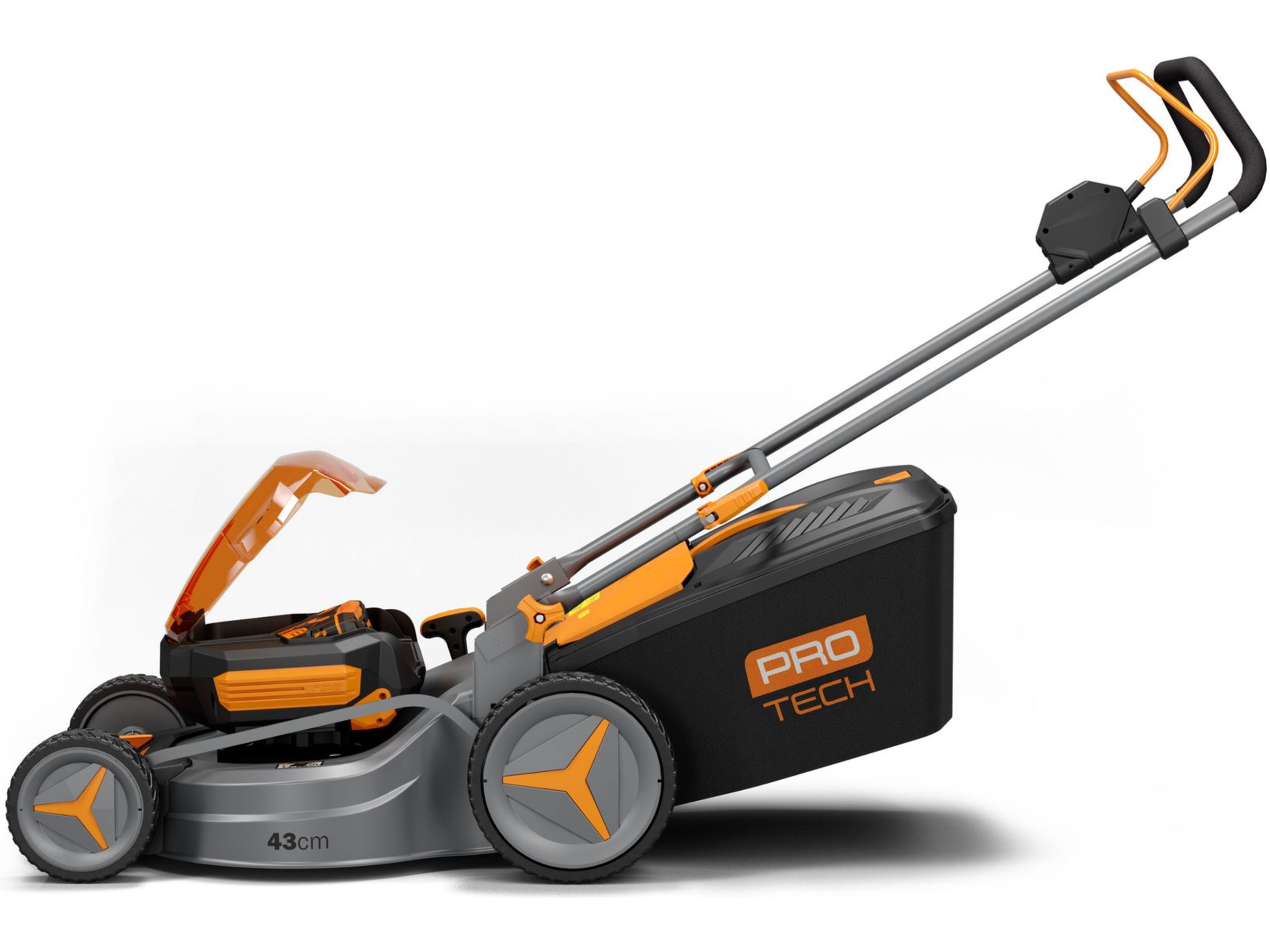 62-volts batteridrevet gressklipper med børsteløs motor for bedre ytelse, lengre kjøretid og lavere støynivå. Kuttebredde 43 cm og med mulighet til å klippe i seks ulike høyder. Det robuste stål dekselet og den børsteløse motoren gir lavt støynivå og effektiv klipping. Du kan velge mellom to forskjellige klippemetoder; med oppsamler eller med bioklipp. Klippehøyden justerer du sentralt og plenklipperen er lett å lagre da du kan felle ned håndtaket og stille klipperen i loddrett posisjon. Det medfølgende +62 Volt 2.5Ah batteriet kan enkelt brukes til andre redskaper i Protech + 62 Volt-serien. Det følger også med batterilader i pakken. Maskinen passer til gressplen under 200 m2.