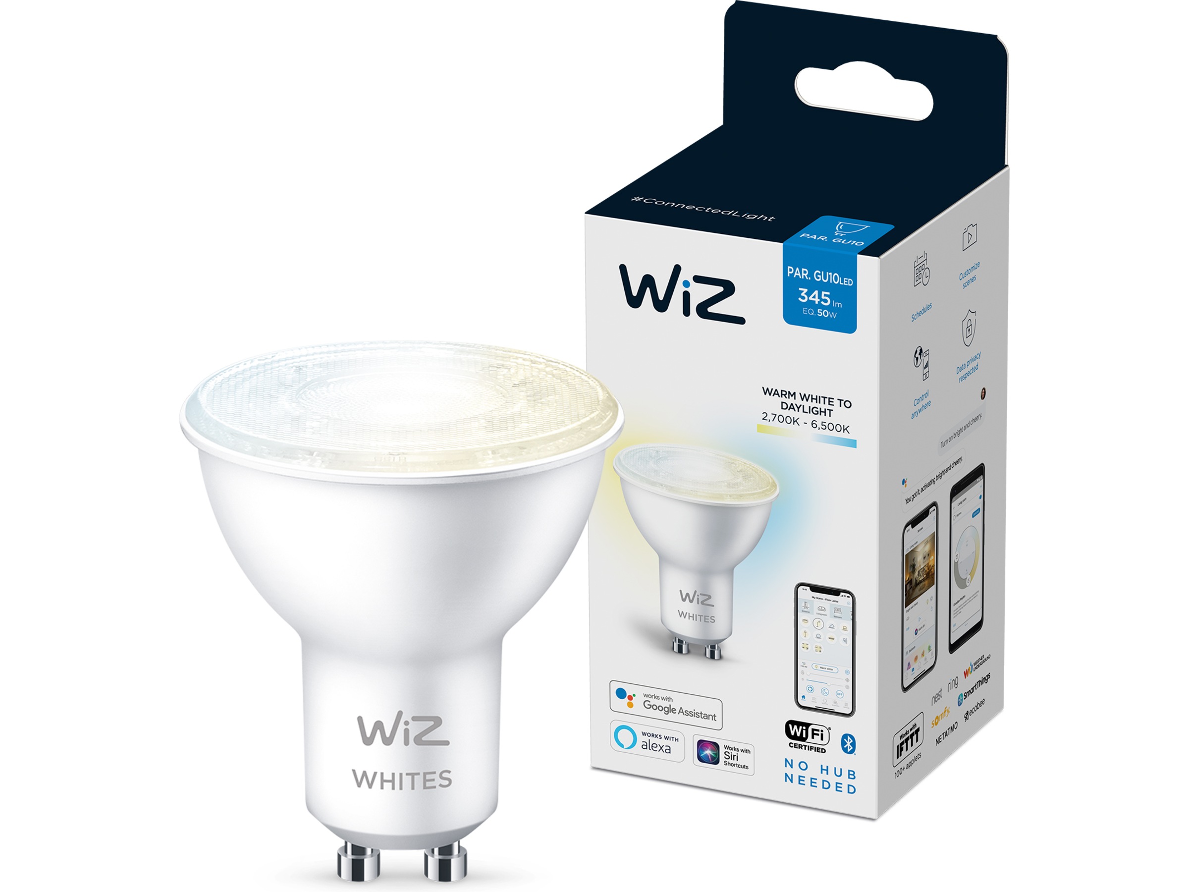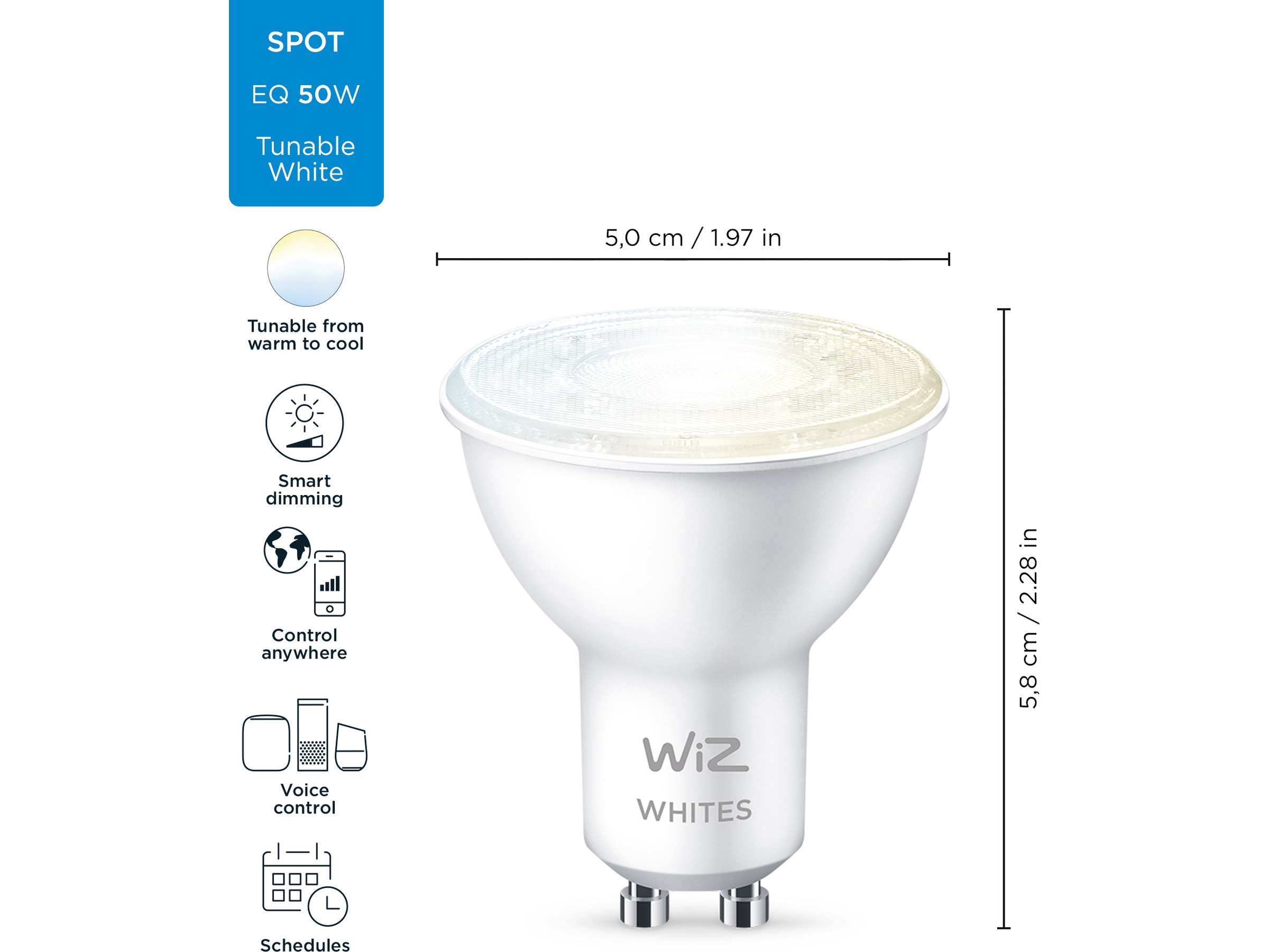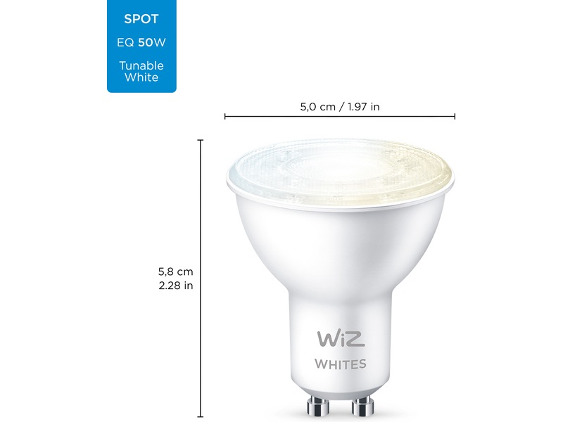 Få alle belysningsnyanser fra varmt til kaldhvitt lys med WiZ tunable white smart-pærer. Med denne GU10-spot, kan dine innebyggede og fritthengende spotter endelig få den riktige lystemperaturen med kraftig høykvalitets LED-belysning.