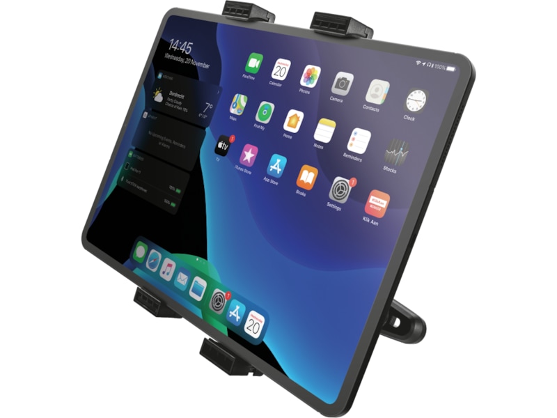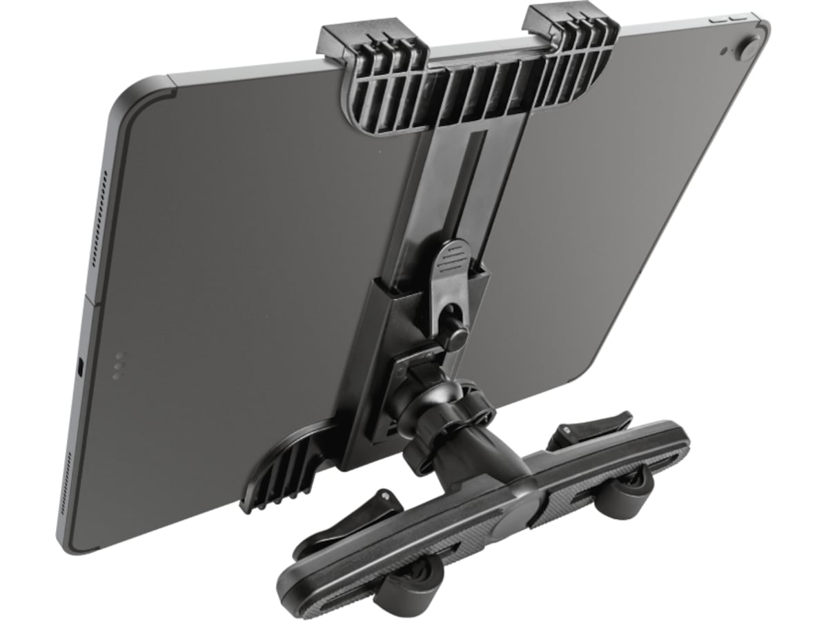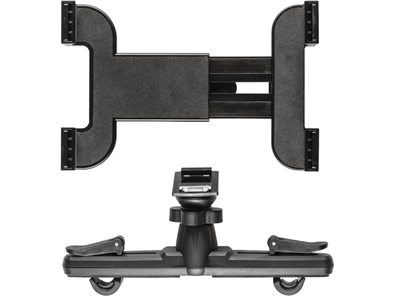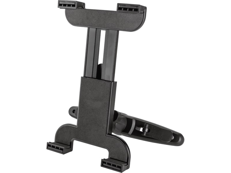 Den robuste holderen har et sikkert og enkelt grep som kan festes til nakkestøtten i alle slags biler. En polstret klemme griper om nettbrettet samtidig som den holder det ripefritt.
