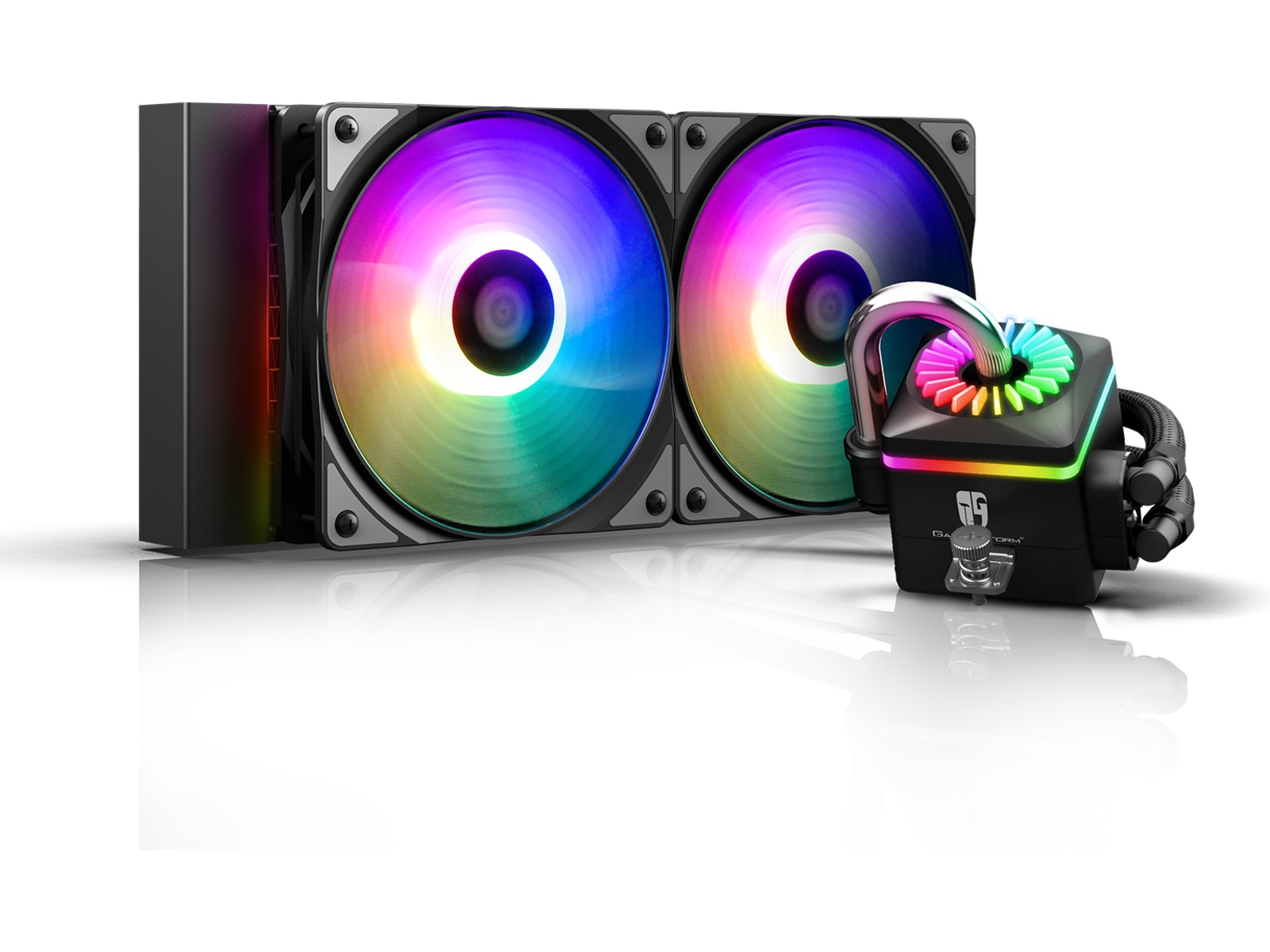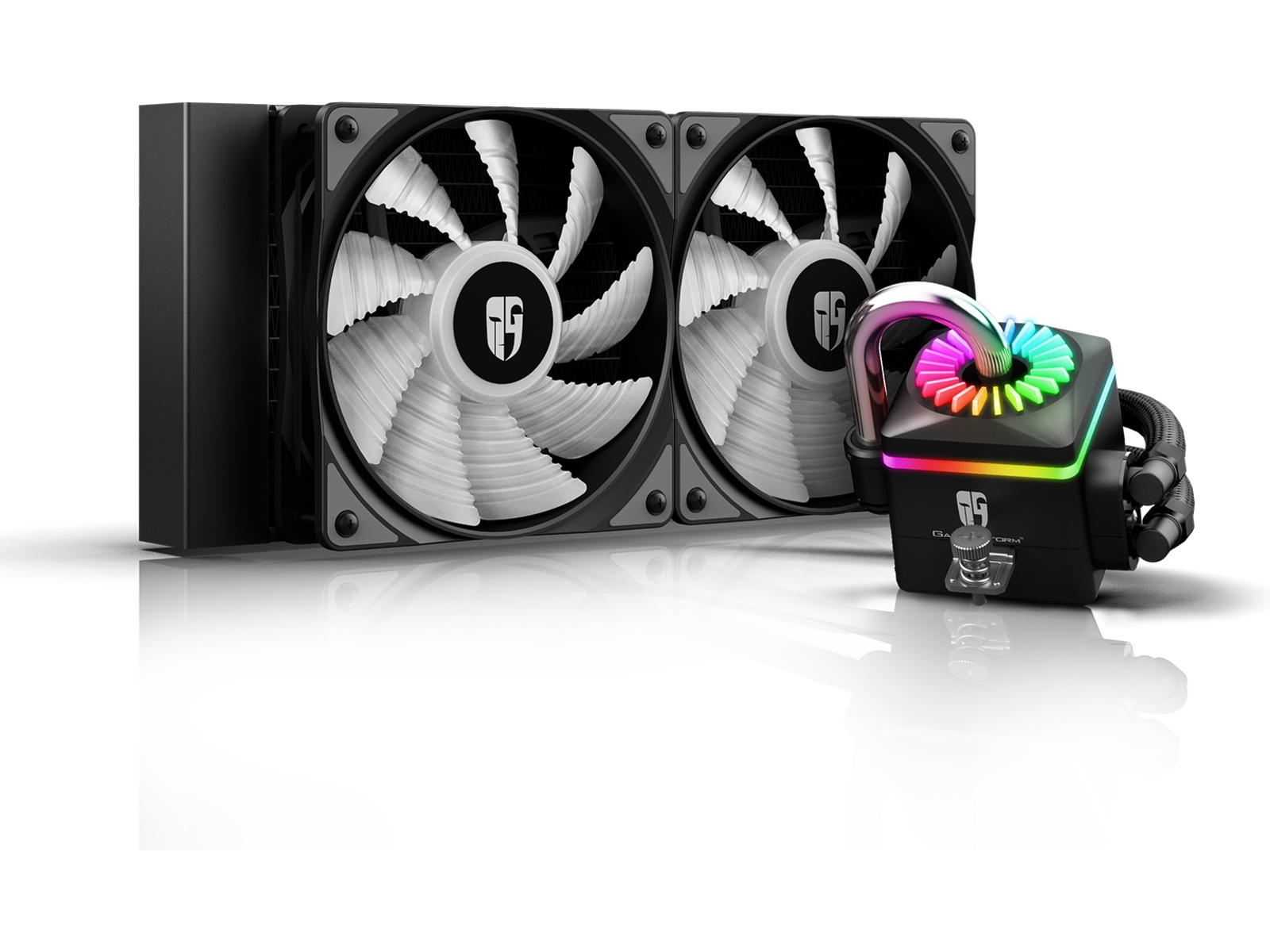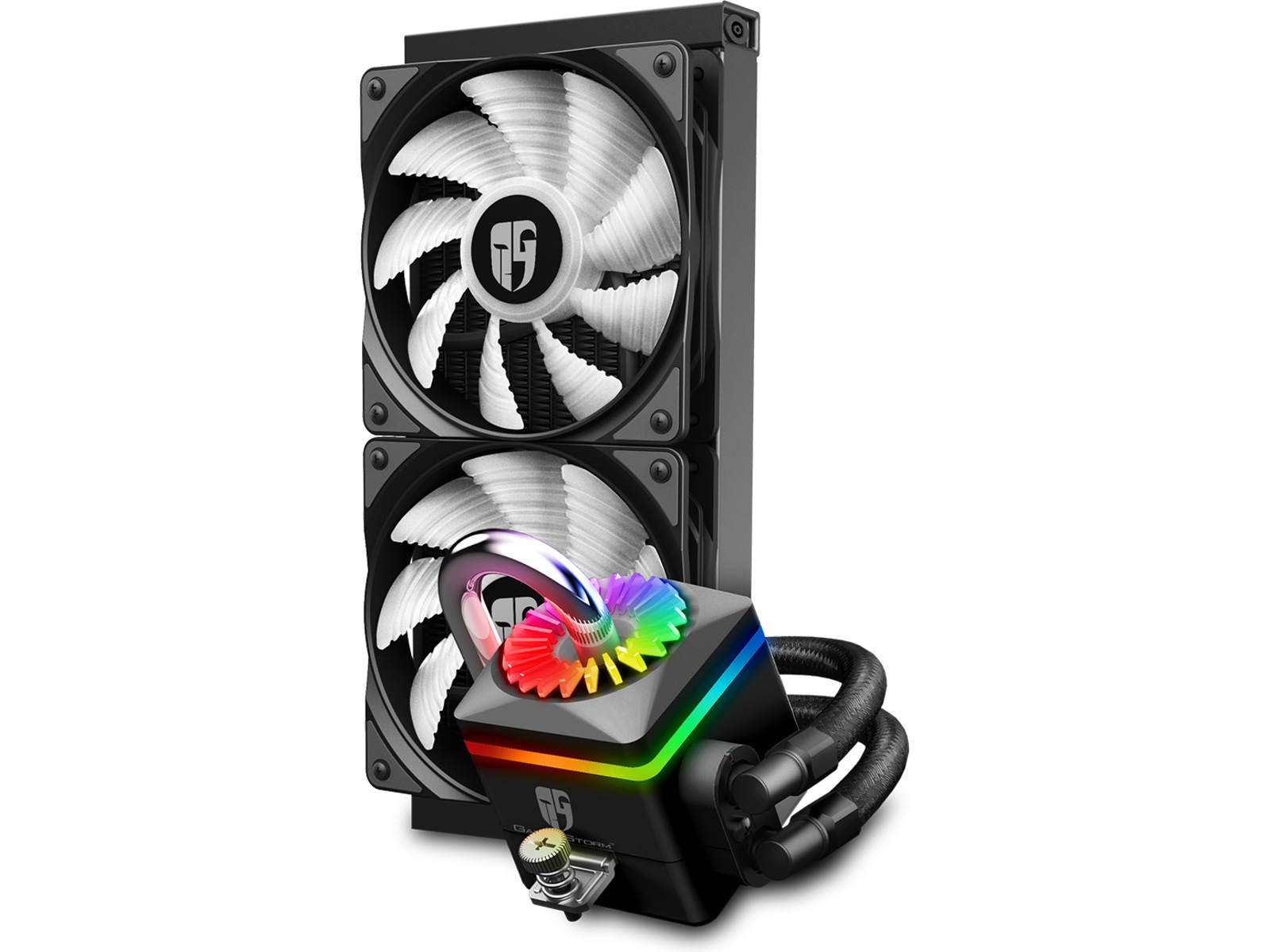 | Funksjoner | Dual-Chamber Design, RGB Sync Ready, Pulsbreddemodulerings-(PWM)-støtte, Anti-leak Tech, Adresserbar RGB LED |