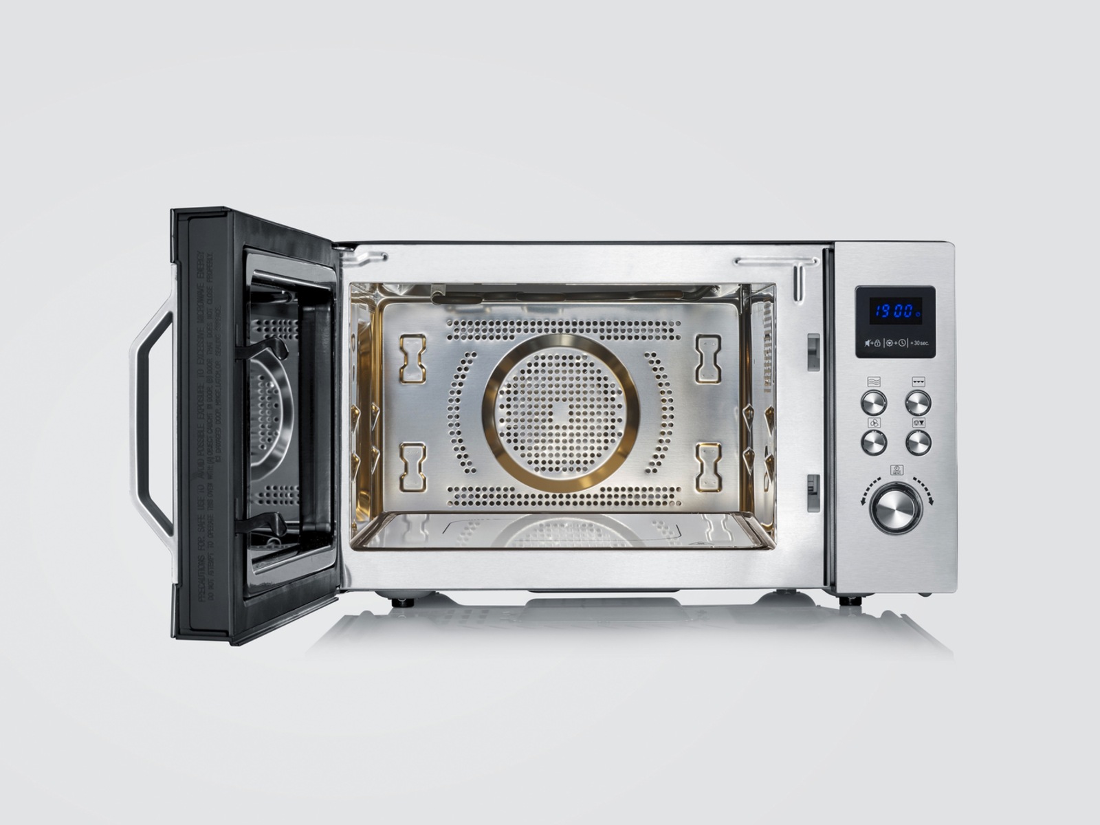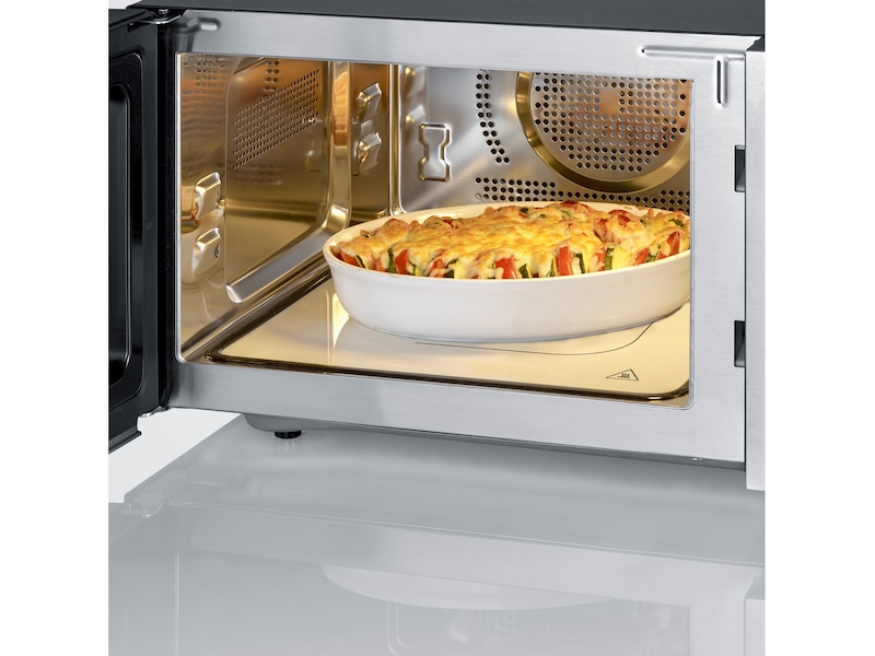 Firkantede gryter og store tallerkener er ikke noe problem for MW 7758 og dens opptil 80 % større bruksflate*. Takket være den innovative keramiske bunnen med mikrobølgereflektor, klarer denne mikrobølgeovnen seg uten en konvensjonell roterende tallerken, og garanterer perfekte resultater. Takket være den integrerte risten og funksjonen for ekstra varm luft på opptil 230 °C er det enkelt å tilberede en rekke bakevarer.