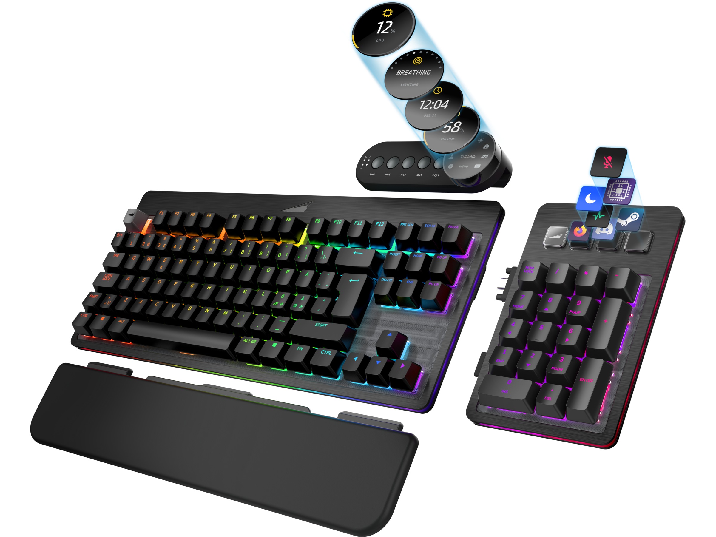 En hel fjellkjede med kontroller og informasjon øverst på tastaturet. Det er også det første i sitt slag som har et display! I tillegg til lett tilgjengelige mediekontroller vil displayet gjøre det mulig å overvåke systemet, vise eller bytte profil.