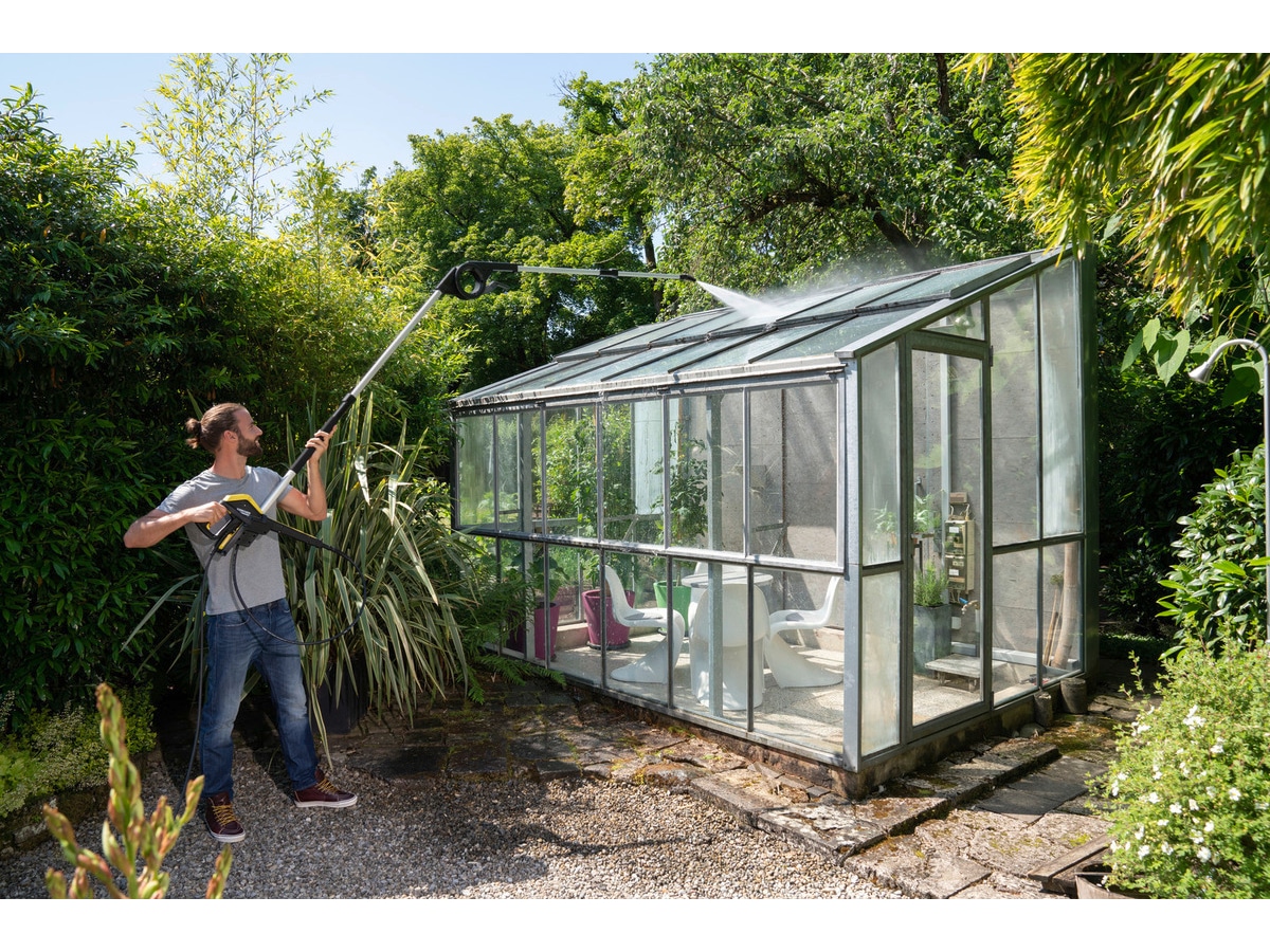 En annen fordel er hengselet som kan justeres 180 grader, noe som gjør det mulig å rengjøre drivhus, skråtak og carporter. Det gjøres enkelt med den praktiske teleskopmekanismen som utløses ved å trykke på en knapp.