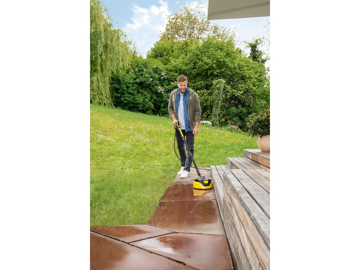 Terrassevaskeren T 5 er effektiv til vask av bl.a. terrasse, platting, fasade, oppkjørsel, garasjeport. uten å sprute eller søle vann. Terrassevaskeren har to roterende dyser under som fjerner skitt fra store overflater nesten dobbelt så raskt som ved bruk av vanlig strålerør.