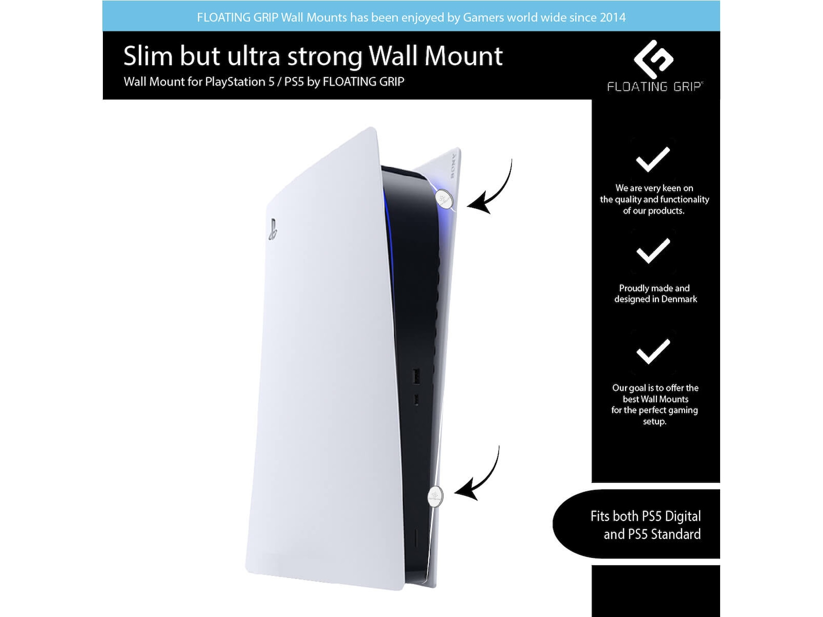 Design, kvalitet og funksjonalitet er noen av de viktigste kjennetegnene til FLOATING GRIP-produktene. Alle FLOATING GRIP-veggfester er designet med fokus på funksjonalitet som holder konsollen stabil og sikker når den er festet.