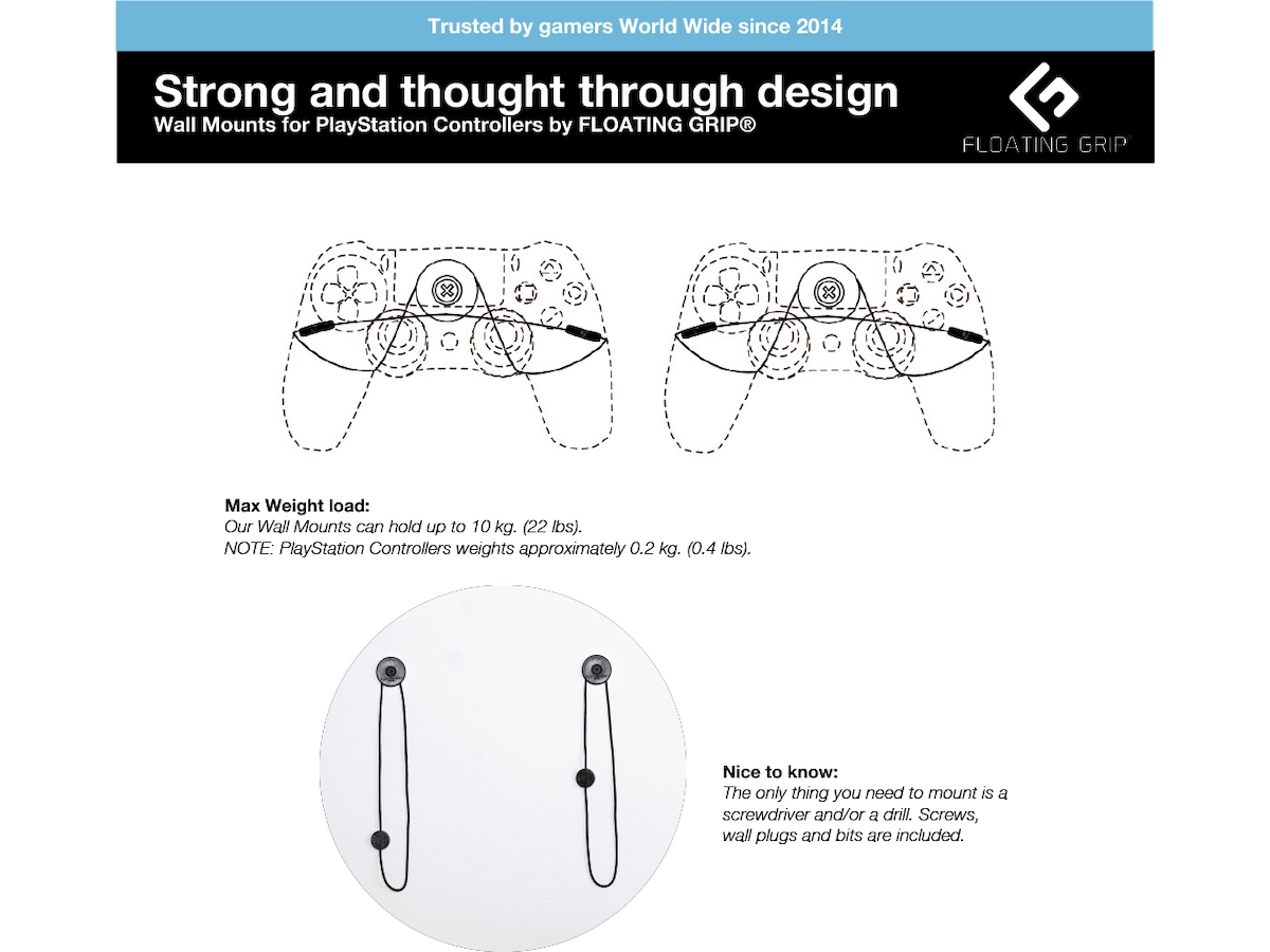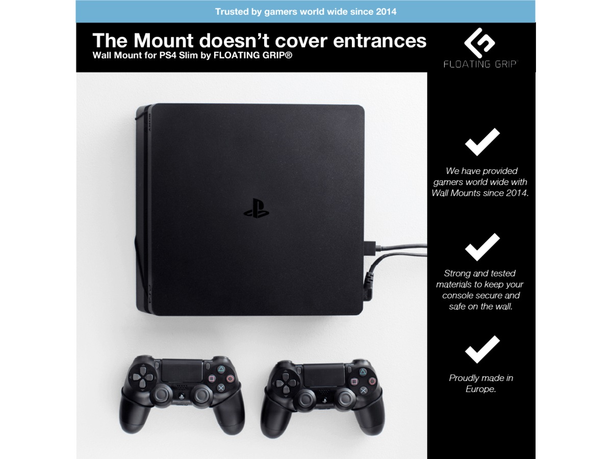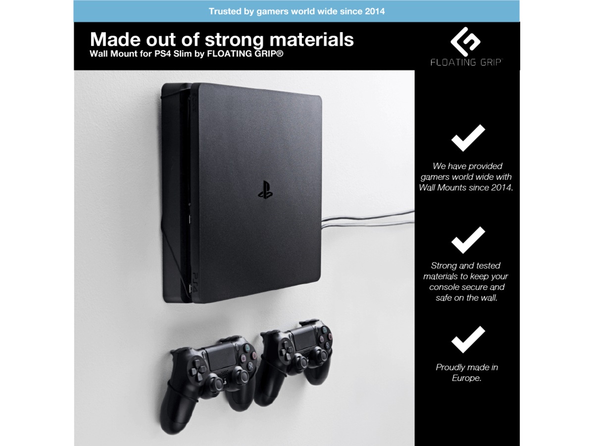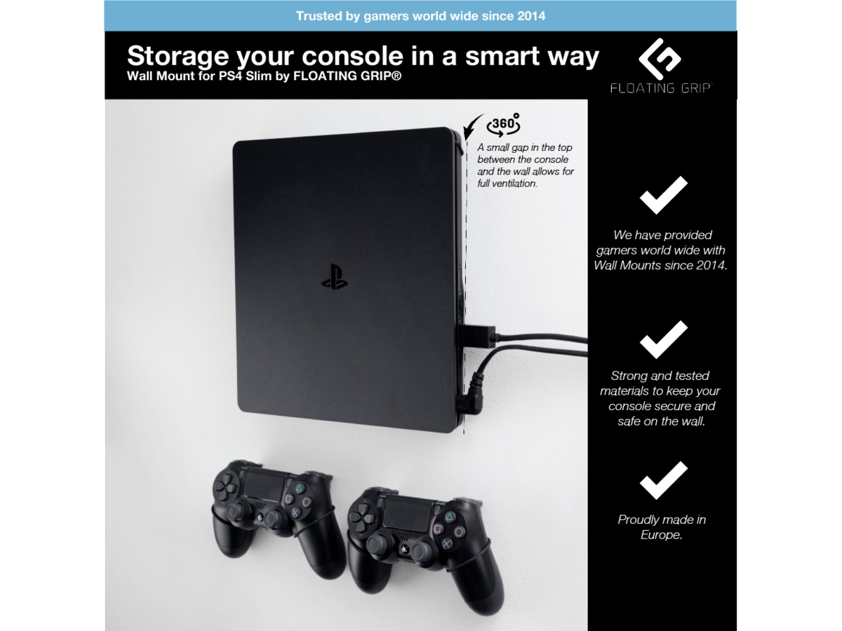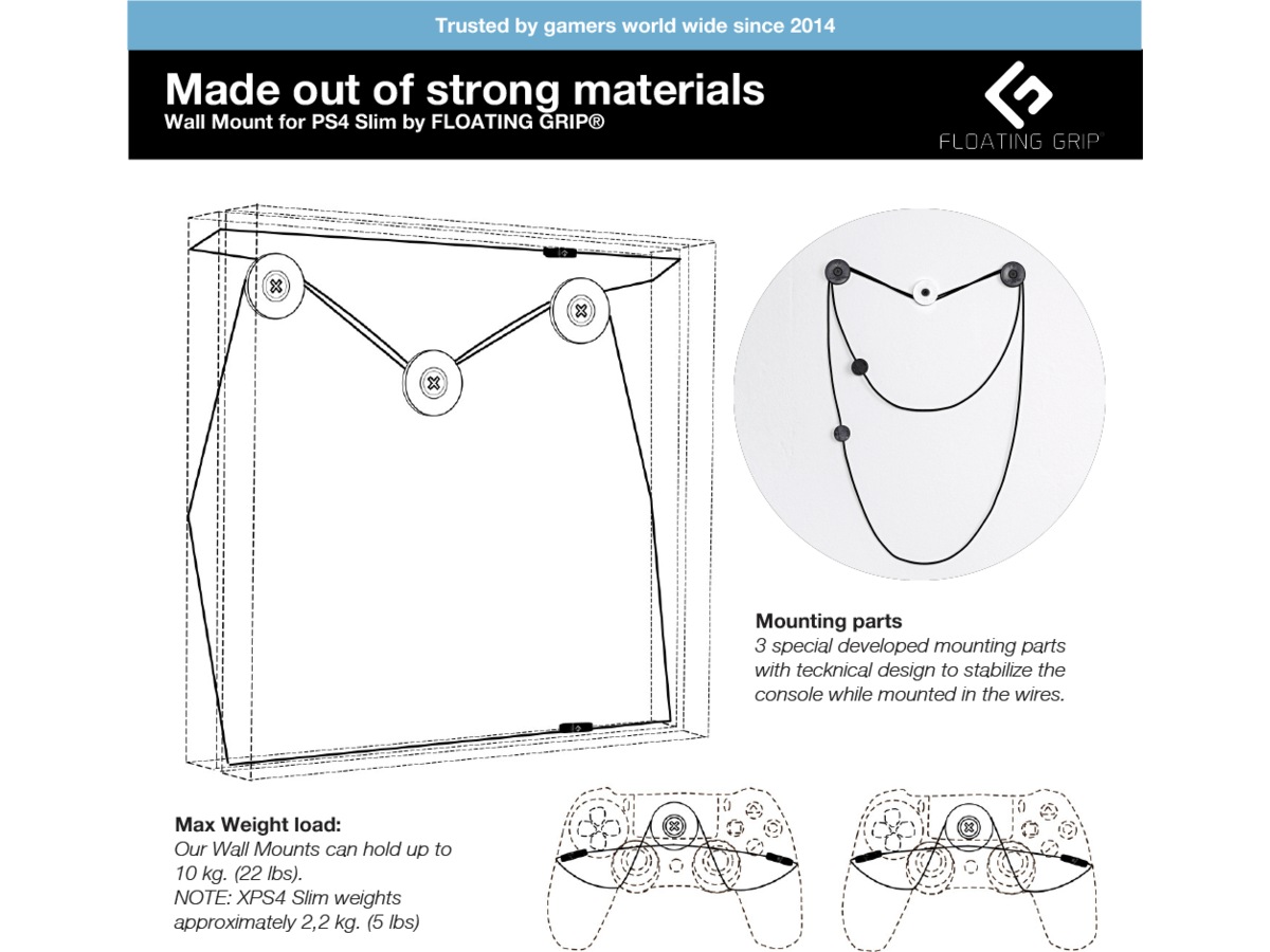 Inkluderer:1x FLOATING GRIP®-veggfeste til PlayStation 4 Slim (PS4 Slim) + 2x FLOATING GRIP®-veggfester til PlayStation-kontrollere