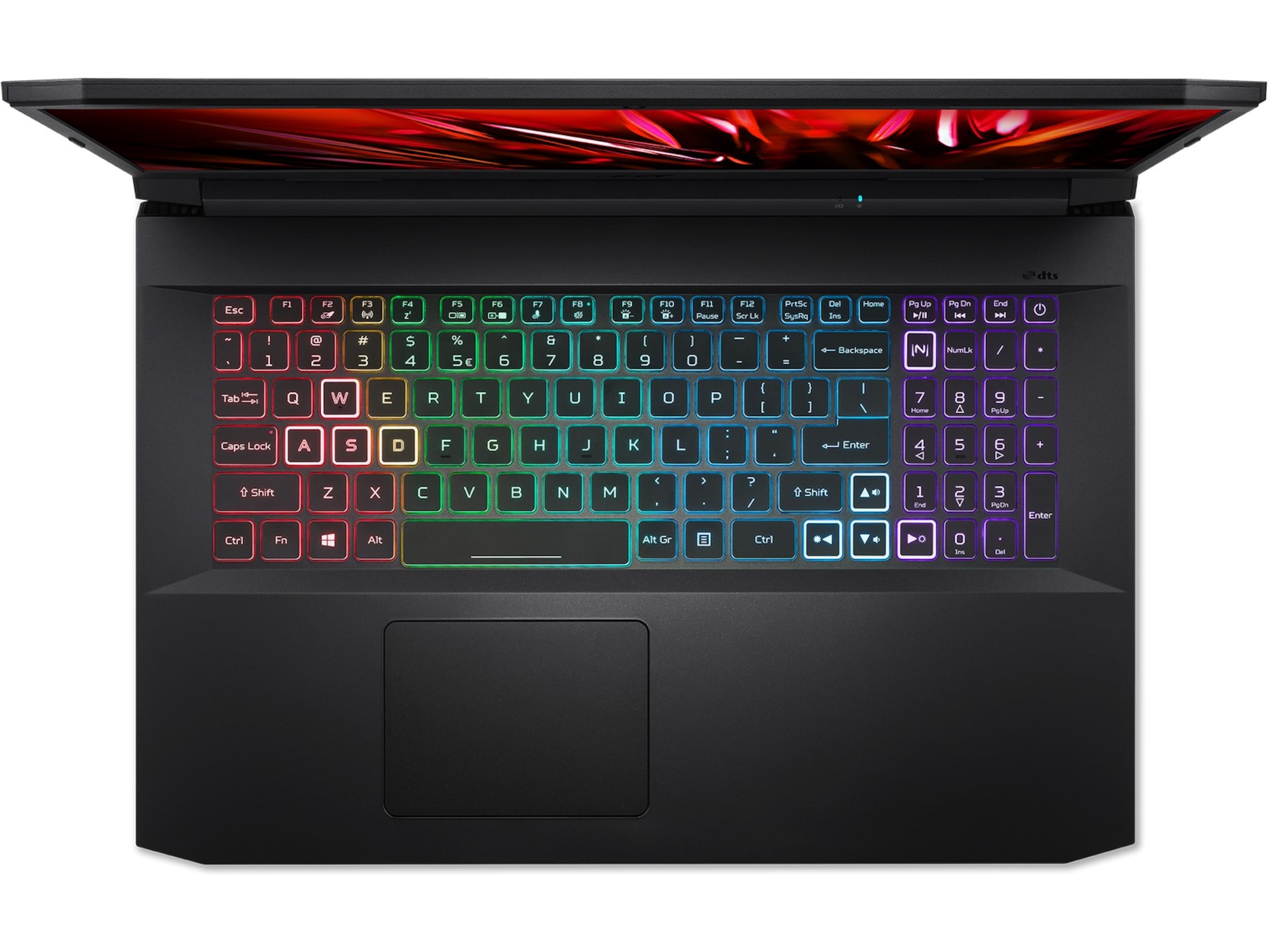 Gjør det litt mer spennende med 4-soners RGB-tastatur, og ta kommandoen over den bærbare PC-en via den dedikerte NitroSense-tasten. WASD- og piltastene er også uthevet for å gi enkel oversikt, samtidig som tastene reagerer umiddelbart med en trykkavstand på 1,6 mm.
