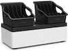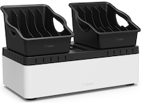 Store and Charge Go med bærbare brett + RockStar™ 10-ports USB-ladestasjon er den ideelle løsningen for å oppbevare og lade flere enheter på en sikker og praktisk måte. Du kan oppbevare opptil 10 enheter på en grunnenhet og feste den sikkert til et skrivebord eller en vegg for å spare plass. Avtagbare brett med fem rom gir bærbarhet for enkel transport. Lad opptil 10 USB-ladingskompatible enheter på én gang samtidig som du holder ladekablene pent oppbevart i grunnenheten. Universell kompatibilitet betyr at Store and Charge Go tilbyr løsninger for Chromebook™-maskiner, laptoper, nettbrett og mer.