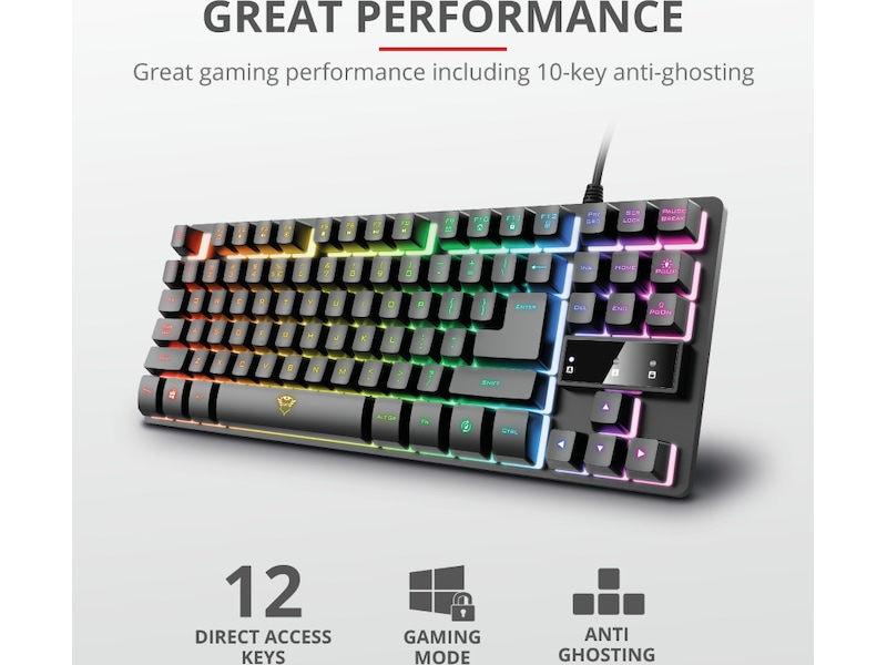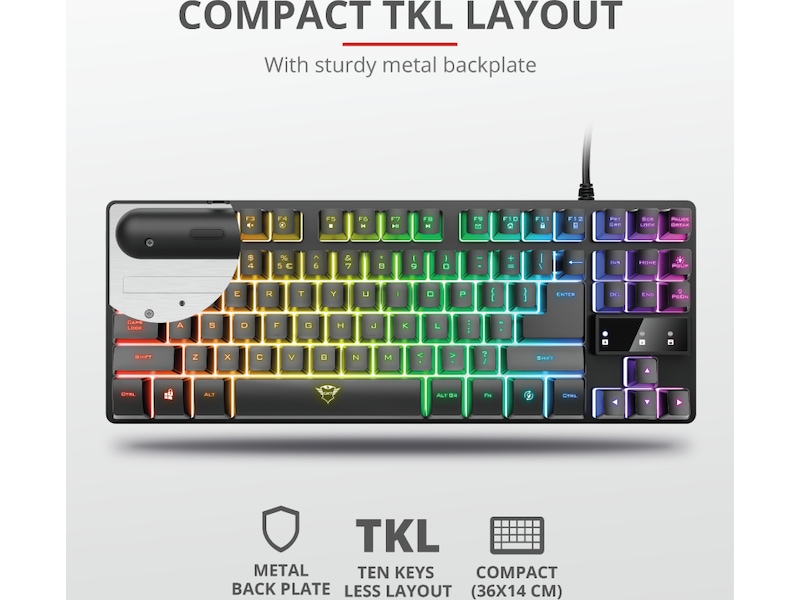Som gamer vil du ha den beste maskinvaren for å sikre veien til seier. Men hvis du liker å ta denne maskinvaren med deg til LAN-partyer, turneringer eller arrangementer, kan en mindre formfaktor være nyttig. Trust GXT 833 Thado er et gamingtastatur uten talltaster, 20 % mindre enn tastaturer med talltaster, noe som gjør det lettere å ta med seg. Bakplaten i metall gjør Thado solid, mens LED-belysningen lyser opp partyet.