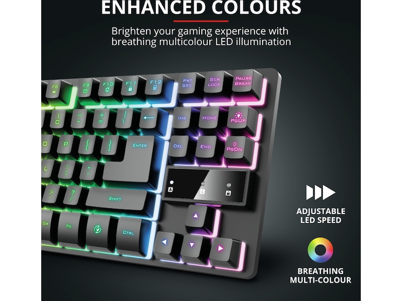Funksjonalitet er en ting, men ikke glem stilen! Takket være LED-belysningen til Trust Thado TKL vil du være sikker på å stille konkurrentene dine i skyggen i alle situasjoner. Så ta en god titt på pusteeffekten, fokuser på oppgaven og begynn å vinne battle royale-kampene.