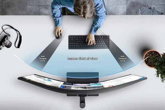 Øk produktiviteten og reduser belastningen på øynene gjennom lange arbeidsdager. 1000R-buen matcher menneskets synsfelt, noe som gjør at du ser innholdet med et raskt blikk. Samtidig har bueformen vist seg effektiv når det gjelder å redusere belastningen på øynene sammenlignet med flate bildeskjermer, og gir dermed en mer behagelig opplevelse.