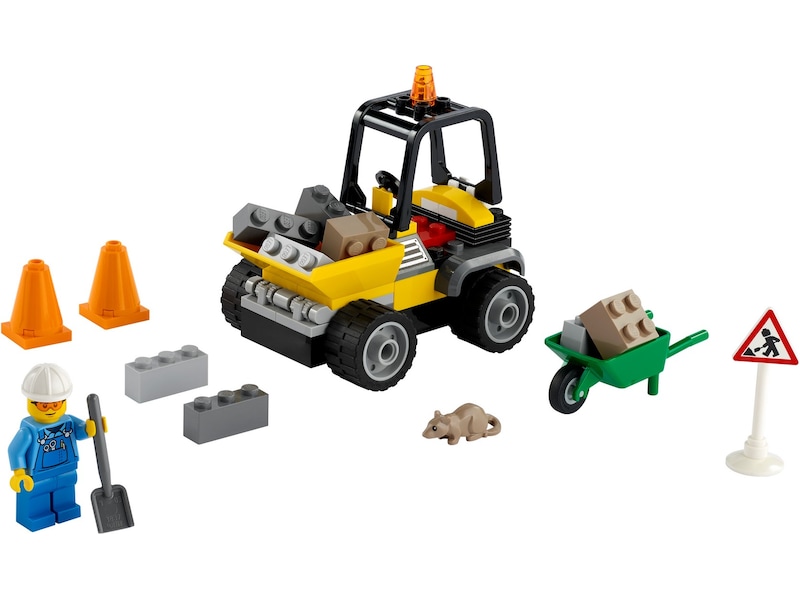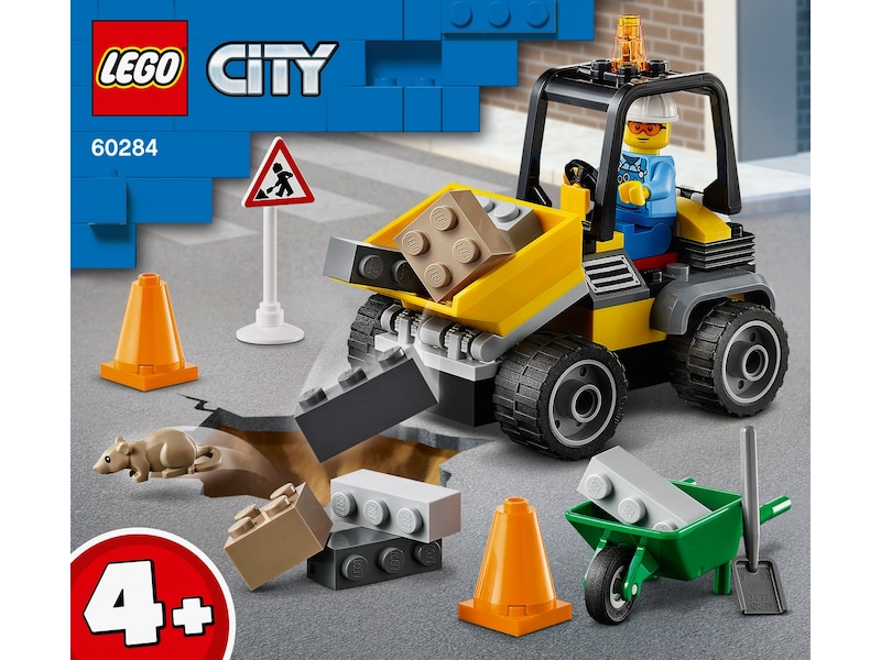 - Lekesettet LEGO® City Veiarbeidsbil (60284) inneholder en hjullaster med frontmontert tippskuffe, trillebår, trafikk-kjegler, veiarbeidsskilt og spade samt en minifigur av arbeider og en rottefigur.