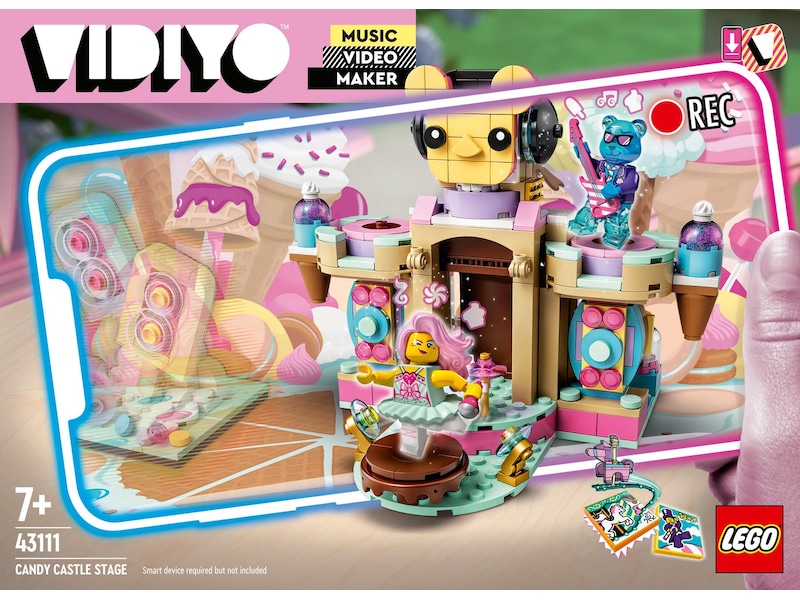 Med LEGO VIDIYO Candy Castle Stage (43111) kan du la barn oppleve en verden hvor de kan regissere, produsere og spille i sine egne popmusikkvideoer. Last ned gratisappen for å skanne og bli kjent med ballerina- og bamse-minifigurene. Skann deretter modellen og bruk den som scene i barnets musikkvideoer. Barn elsker å delta i utfordringer og mye annet mens de produserer egne musikkvideoer som de kan dele med andre i den barnesikrede feeden.