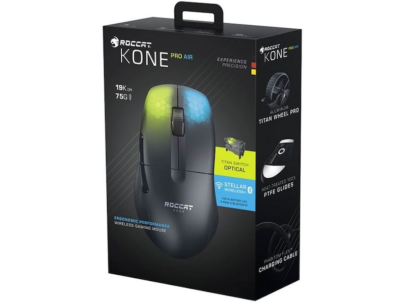 Hils på ROCCAT® Kone Pro Air ergonomisk optisk trådløs gamingmus med RGB-belysning, den første trådløse musen fra Kone noensinne. Kone Pro Air er perfeksjonert på grunnlag av 14 års håndverk, med en vekt på bare 75 g. Den er lett, komfortabel og avansert. Den bruker Titan Switch Optical, AIMO RGB-belysning, vår 19K DPI Owl-Eye-sensor, USB-C PhantomFlex™-ladekabel og varmebehandlede glidere.