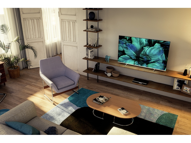 Ser du etter en TV som passer i rommet? Denne 4K smart-TV-en er kledd for anledningen! Den praktisk talt rammefrie skjermen fungerer med nesten alle typer interiør. De slanke føttene får det til å se ut som om skjermen flyter over TV-enheten eller bordet.