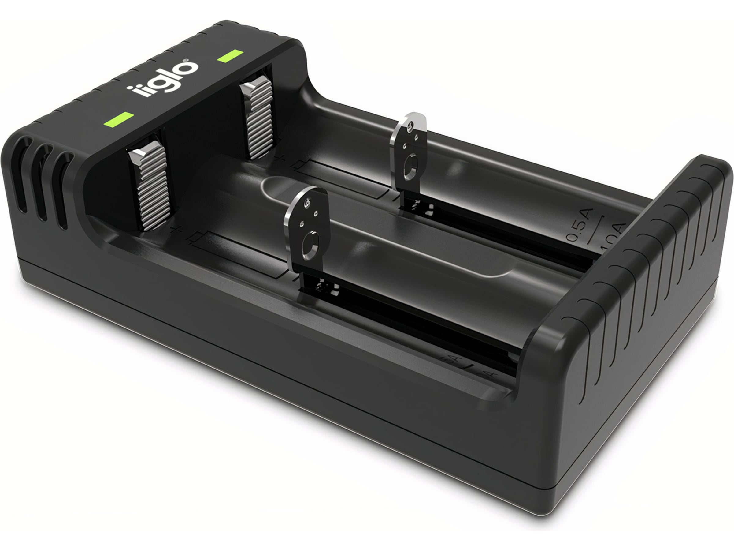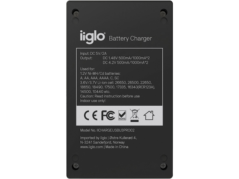 iiglos praktiske USB-batterilader kan lade 2 batterier samtidig, enten de er av typen litium-ion (Li-Ion), nikkel-metallhydrid (Ni-MH) eller nikkel-kadmium (Ni-Cd). Den medfølgende Micro-USB-kabelen lar deg gi strøm til batteriene med en hvilken som helst 5 V USB-utgang, for eksempel veggladere, powerbanks og billadere. LED-indikatorene på laderen blir grønne når batteriene er fulladet.