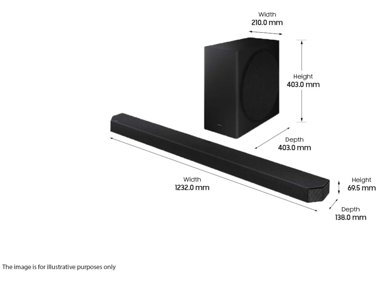 | Dimensjoner (BxDxH) / vektdetaljer | Subwoofer: 21 cm x 40.3 cm x 40.3 cm / 9.8 kg, Lydbjelke: 123.2 cm x 13.8 cm x 6.95 cm / 7.1 kg |