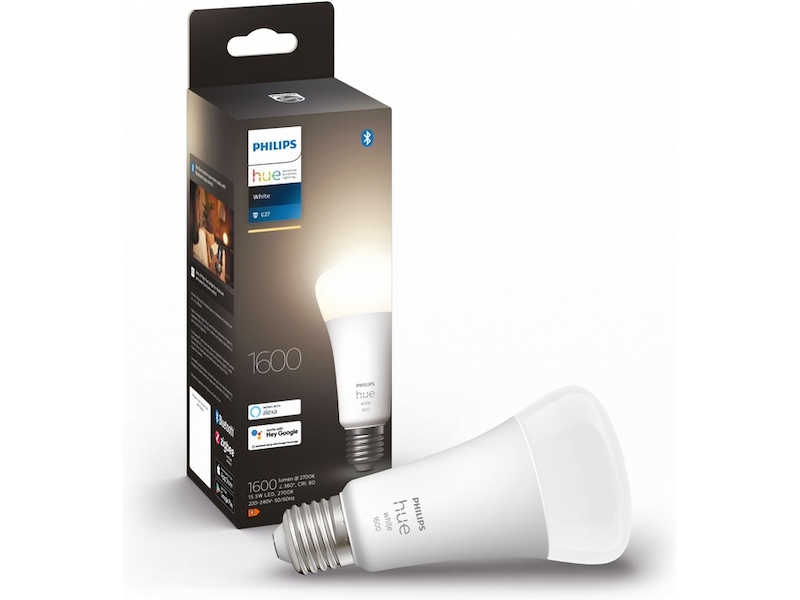 Denne Philips Hue White 100W E27 1-pakingen inneholder én LED-lyskilde med høy effekt. Disse lyskildene gir et lys med standardtemperatur på 2700 kelvin.