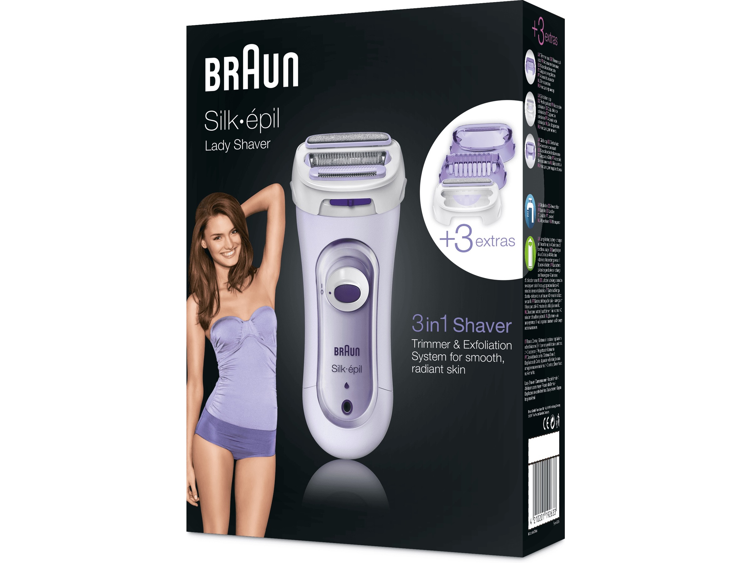 - 3 ekstra tilbehør: trimmertopp for bikinilinjen og sensitive områder, eksfolieringstilbehør og glidetopp
