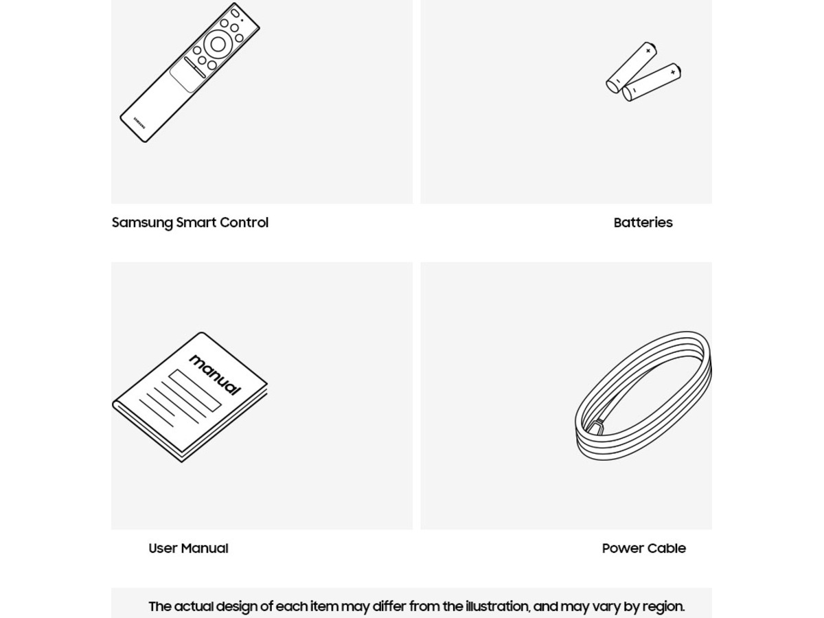 Det følger med fot, fjernkontroll og strømkabel.