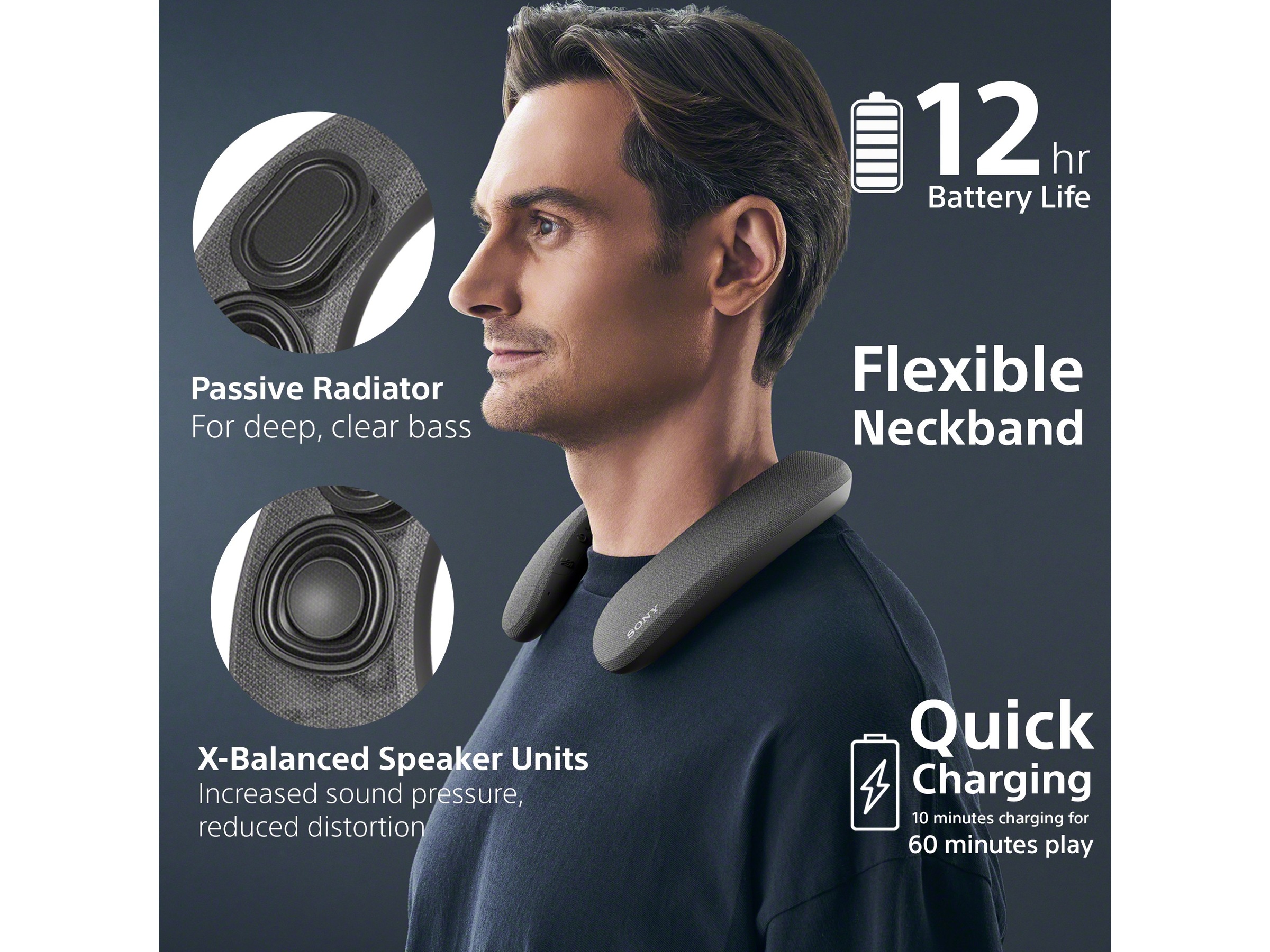 Sonys unike X-balanced høyttalerenheter øker lydtrykket og reduserer støy. Høyttalerne vender oppover i retning av lytteren, slik at du kan oppleve klokkeklar lyd og fyldig bass. Samtidig hjelper de oppovervendte enhetene med å redusere støy for andre rundt deg.
