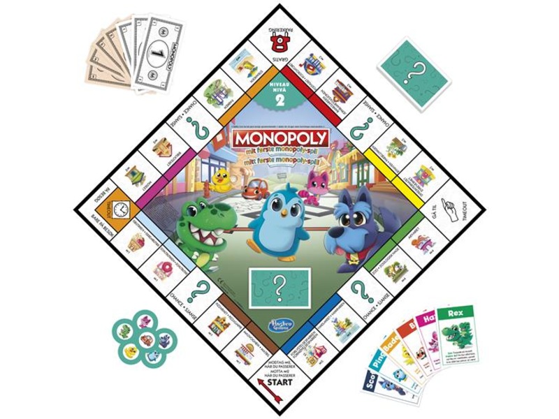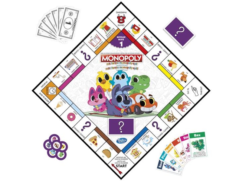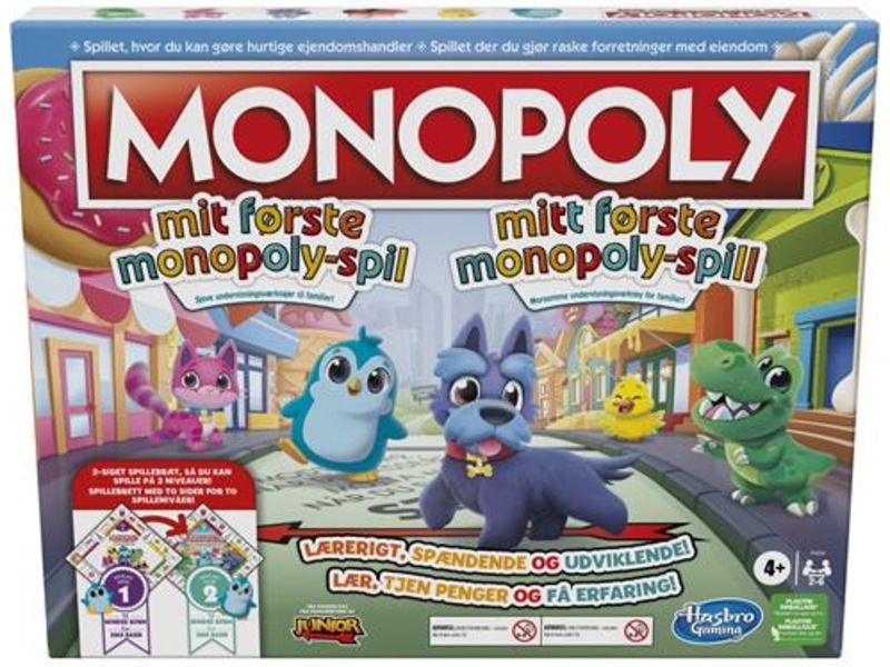 Mitt første monopol er et morsomt læringsverktøy for familier. Spillet har et dobbeltsidig spillebrett med 2 spillnivåer, slik at dere kan velge det nivået som passer best til familien.