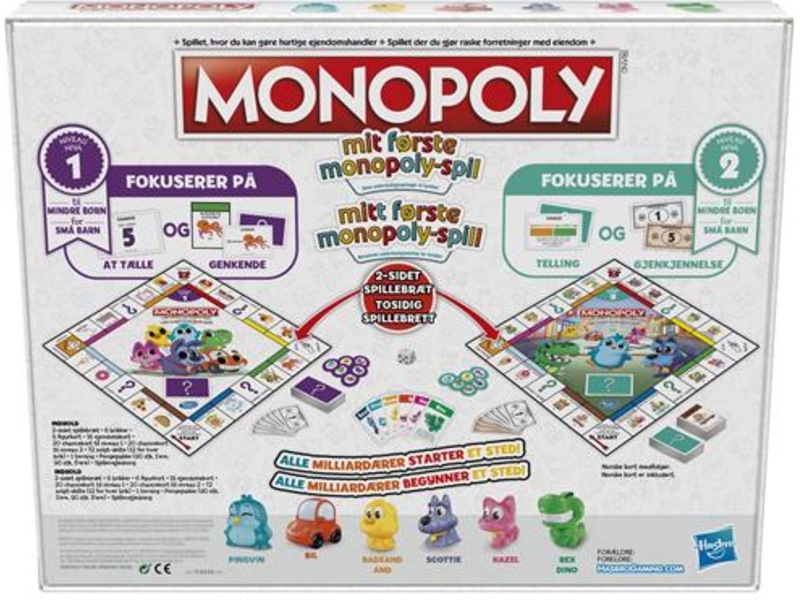 Den ene siden fokuserer på å telle og matche, og anbefales til barn i alderen 4 til 5 år. Snu brettet for et mer avansert spill som fokuserer på lesing og enkel matematikk – anbefales til barn fra 6 år. Hvert spillnivå har sine egne Monopol-penger og -kort samt regler. Spillet er inspirert av det klassiske Monopol-spillet – alle milliardærer må jo begynne et sted!