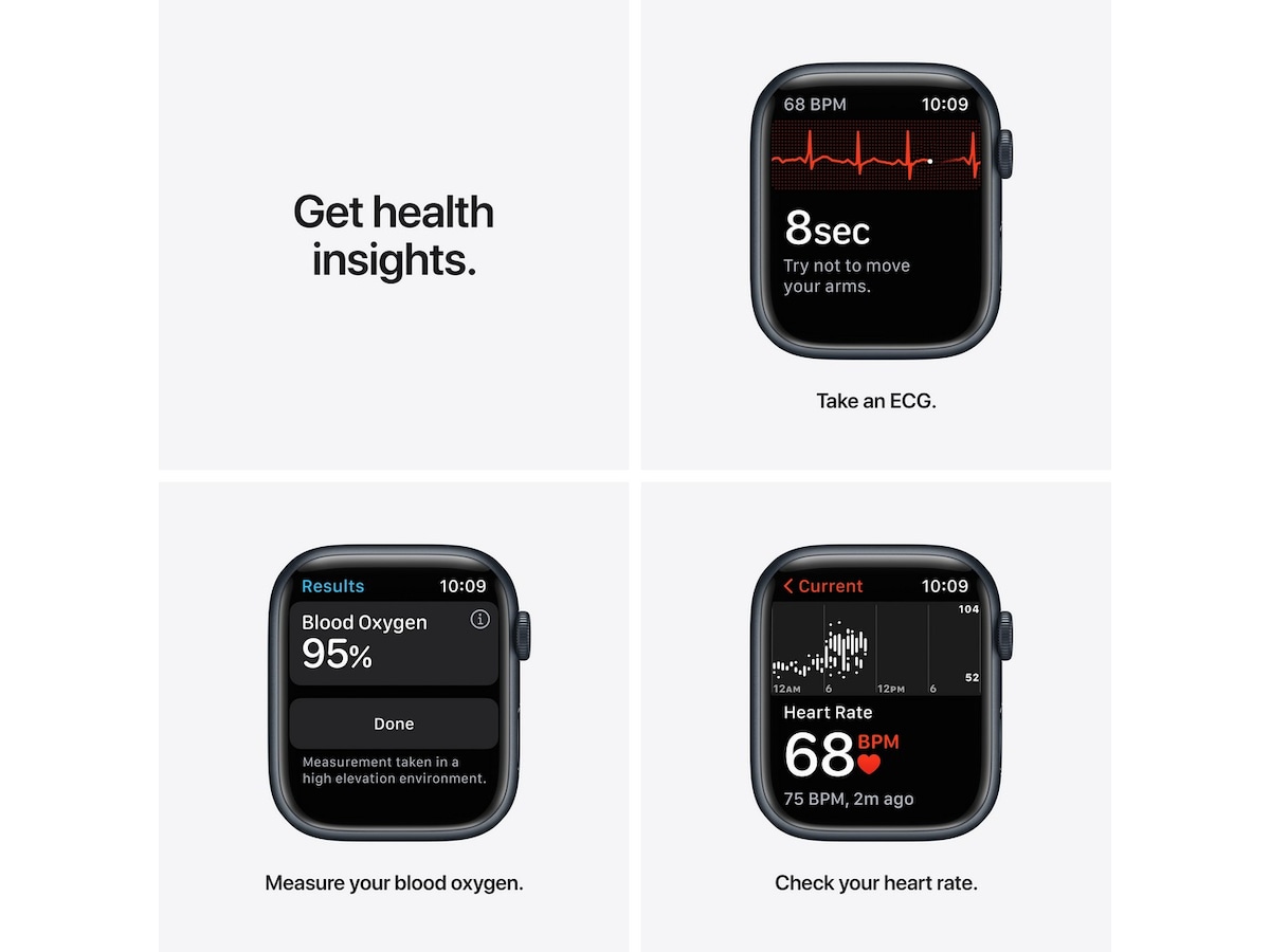 En avansert sensor og app som måler oksygenmetningen i blodet.¹ Muligheten til å ta et EKG når som helst.² Varslinger ved uvanlig høy eller lav puls og ujevn hjerterytme.³ Og apper for oppmerksomt nærvær og søvnsporing. Apple Watch Series 7 gir deg tilgang til avanserte helsefunksjoner rett fra håndleddet.