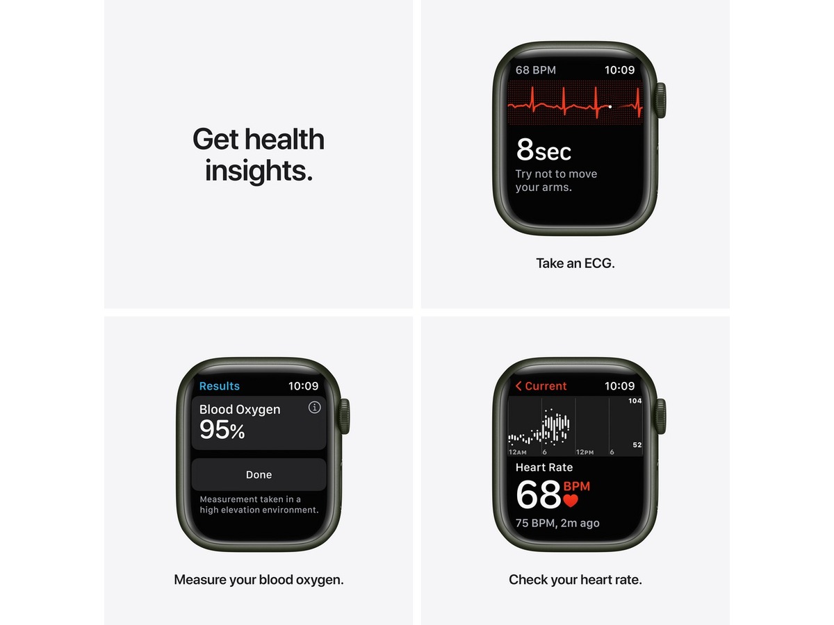 En avansert sensor og app som måler oksygenmetningen i blodet.¹ Muligheten til å ta et EKG når som helst.² Varslinger ved uvanlig høy eller lav puls og ujevn hjerterytme.³ Og apper for oppmerksomt nærvær og søvnsporing. Apple Watch Series 7 gir deg tilgang til avanserte helsefunksjoner rett fra håndleddet.