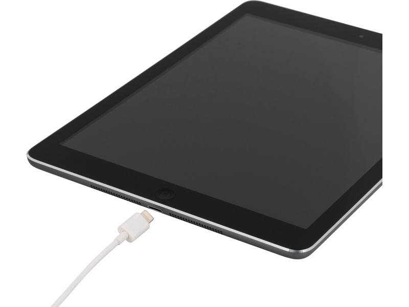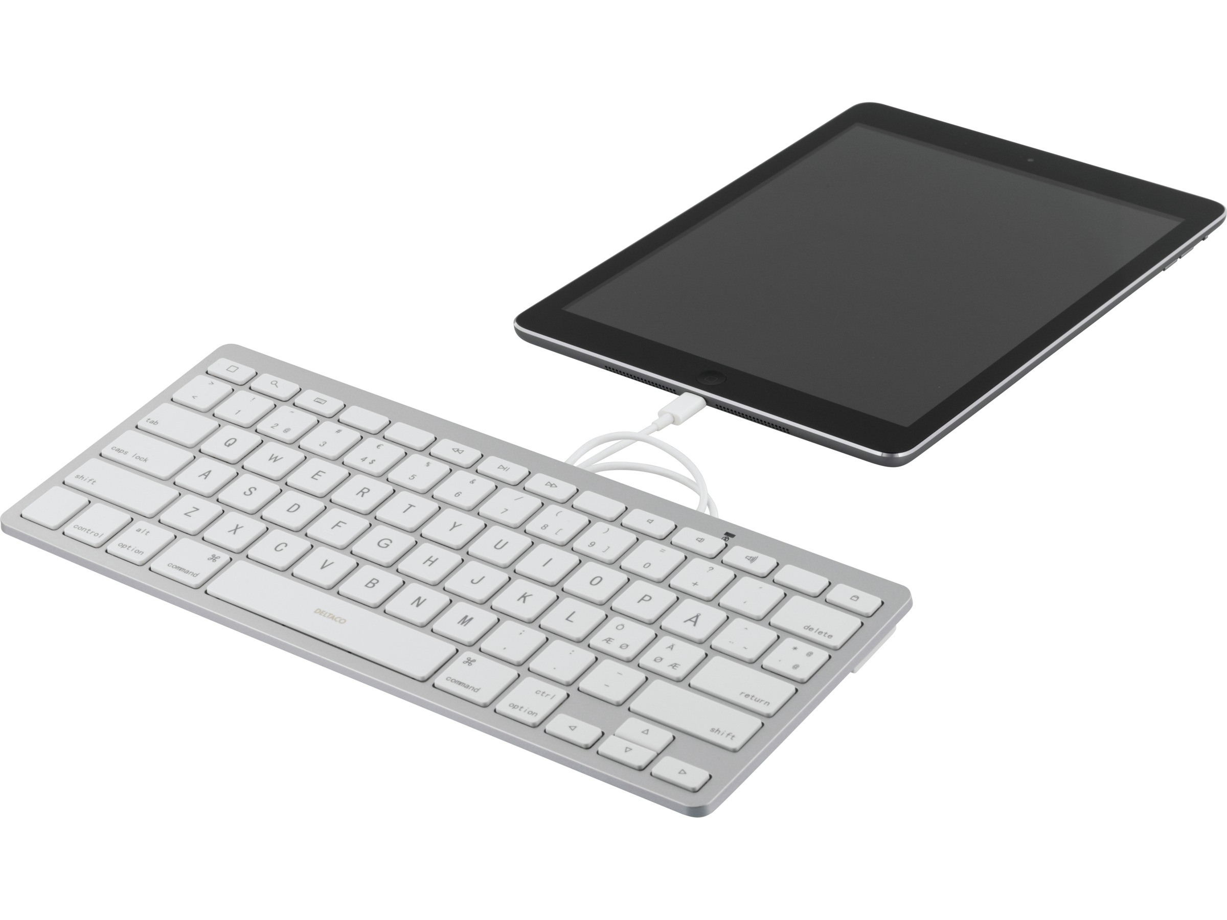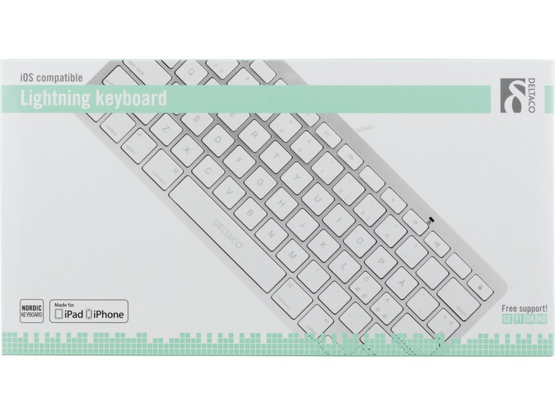Jevnt tastatur som er tilpasset for iOS-enheter med lightning-tilkobling. Har du f.eks en iPad Air så kobler du inn kabelen i enheten og alt er klart for bruk direkte.