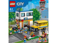 - Hva inneholder esken? Alt barn trenger for å bygge en toetasjes skolebygning, skolegård, skolebuss, bussholdeplass, sykkel og sju minifigurer, inkludert to fra LEGO® City TV-serien, samt en ekornfigur