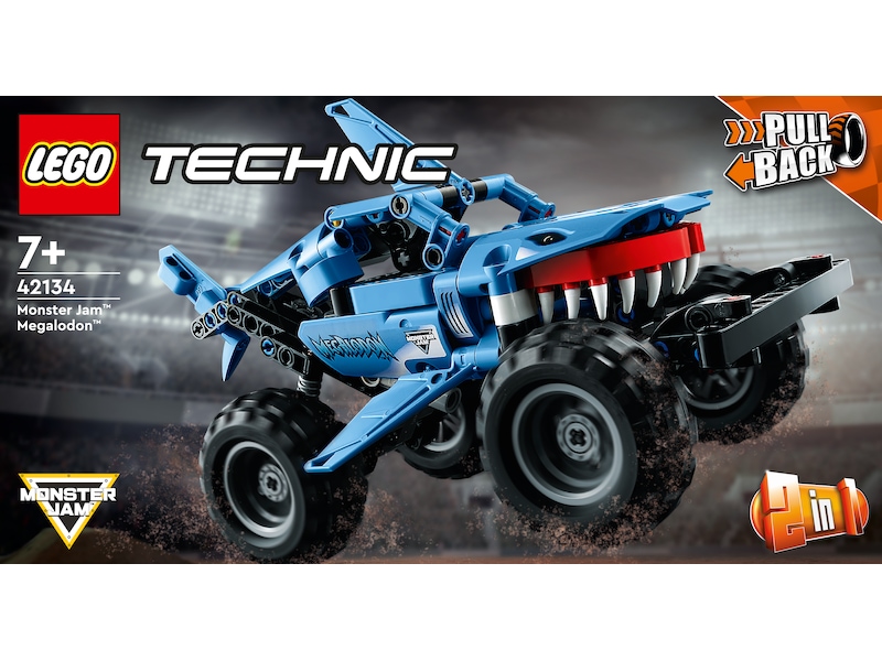 LEGO® Technic Monster Jam™ Megalodon™ settet får barn en mektig opplevelse med en monstertruck i kombinasjon med den største haien verden noensinne har sett. Monstertrucken er inspirert av den utdødde haien megalodon og er klar til kamp! Gjennomfør imponerende hopp, og bruk pullback-funksjonen for å sende trucken av sted i full fart – akkurat som i virkeligheten. Etterpå kan monstertrucken bygges om til en racerbil som er inspirert av det mytologiske sjømonsteret Lusca.